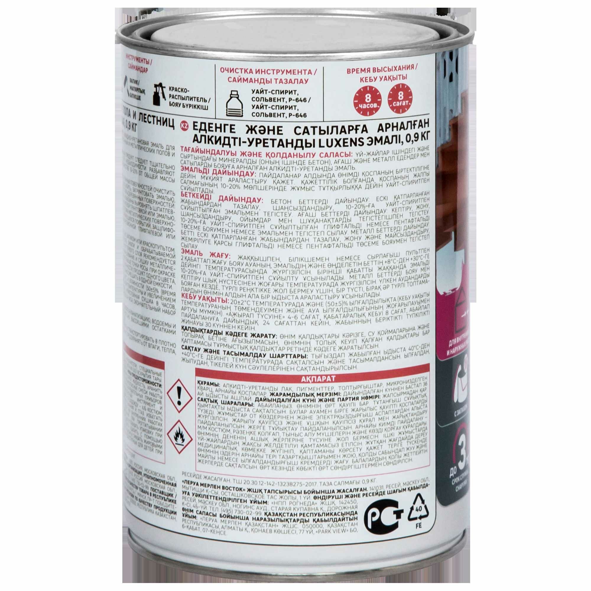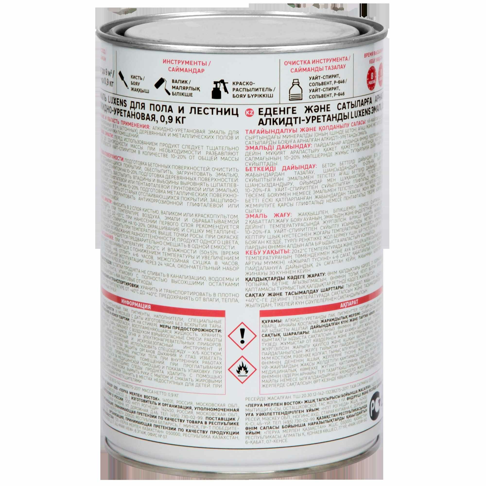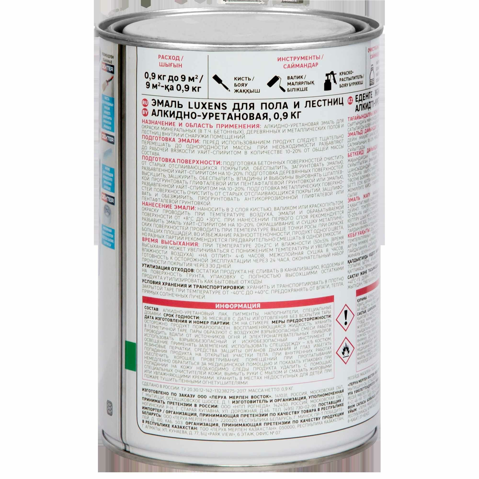 Эмаль для пола и лестниц Luxens — это жидкая алкидно-уретановая краска на основе растворителя. Предназначена для покраски минеральных (в том числе бетонных), деревянных и металлических полов и лестниц внутри и снаружи помещений. Образует влагостойкое глянцевое покрытие. Одной банки объемом 0,89 л (вес краски — 0,9 кг) хватит на окрашивание поверхности площадью до 9 м². Цвет — «венге» (RAL 8017). Страна производства — Россия.