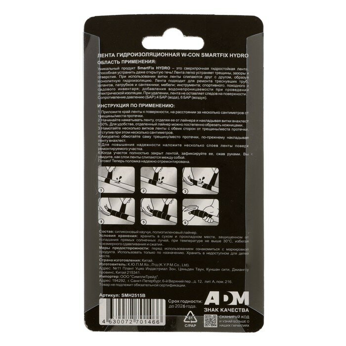 Лента гидроизоляционная SmartFix черного цвета размером 2,5 × 150 см с полиэтиленовым лайнером обладает высоким уровнем прочности, годится для устранения открытых протечек. Материал изделия — силиконовый каучук. Продукт произведен в Китае.