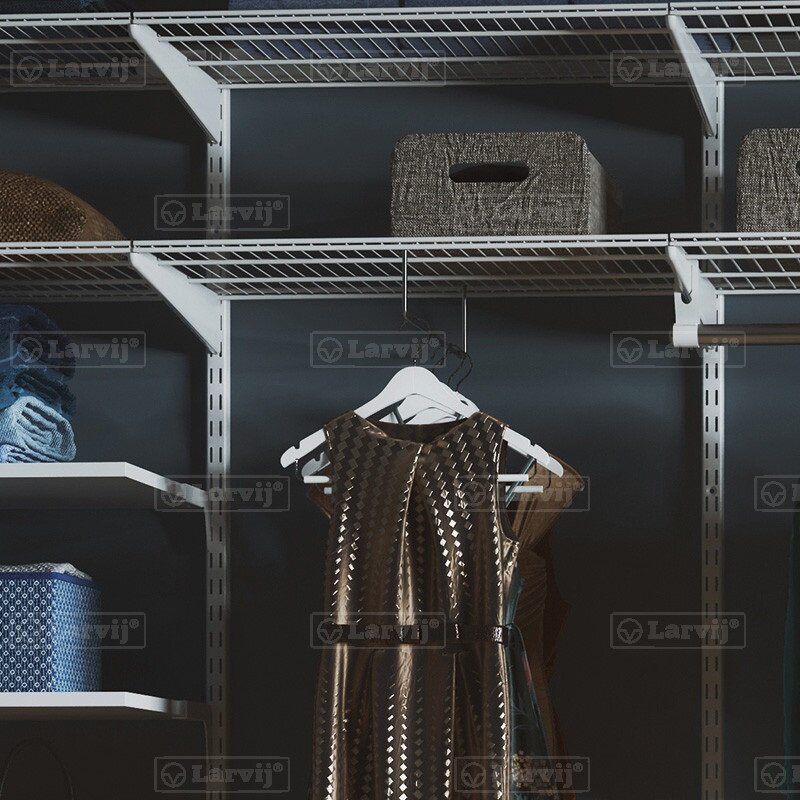 **Штанга поперечная для вешалок Larvij L9707CH** предназначена для оснащения гардеробной, шкафа. Применяется для развешивания вешалок с одеждой. Оснащена зацепами, которые позволяют прикрепить модель к сетчатой полке. Отличается простотой монтажа. Для ухода используют влажную ткань. Не следует применять абразивные средства, чтобы не поцарапать хромированное покрытие.
