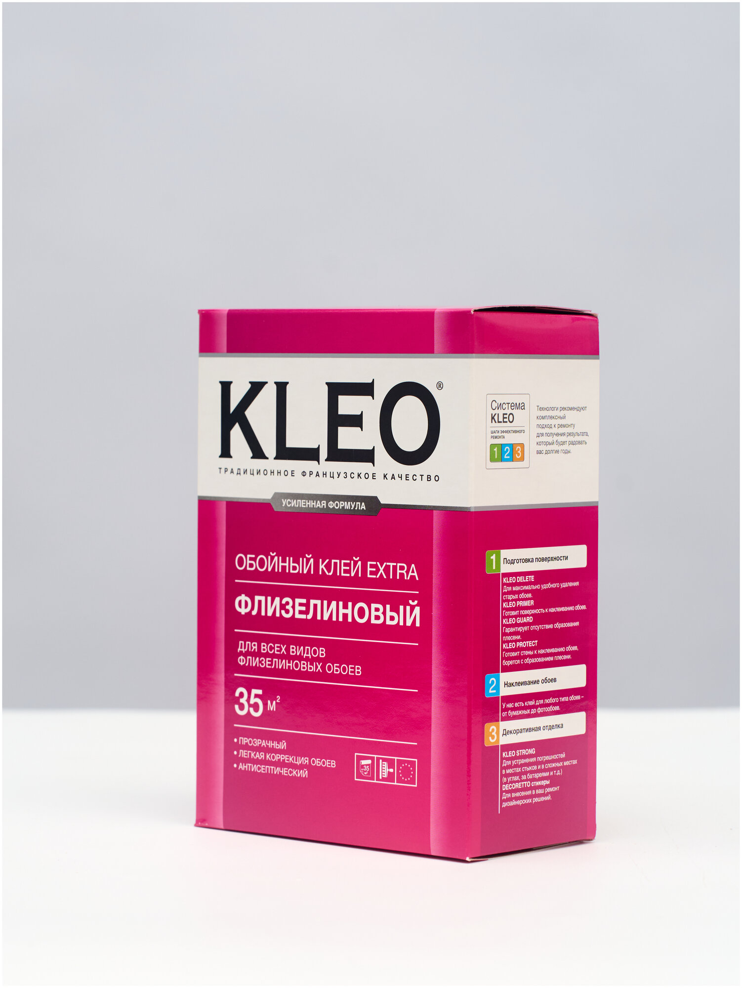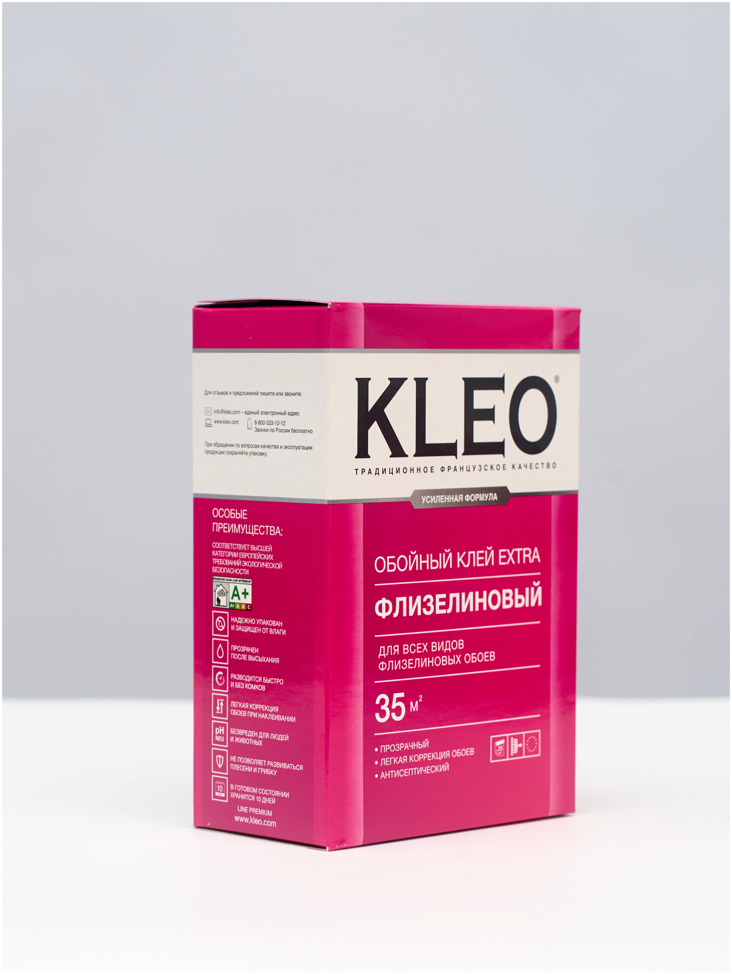 **Клей для флизелиновых обоев Kleo Extra** позволяет легко корректировать полотно после наклеивания. При растворении не образует комков. Готов к нанесению через 5 минут после смешивания с водой. Готовый раствор наносят непосредственно на стену. Его разрешается хранить до 10 суток. Подробная инструкция размещена на упаковке.