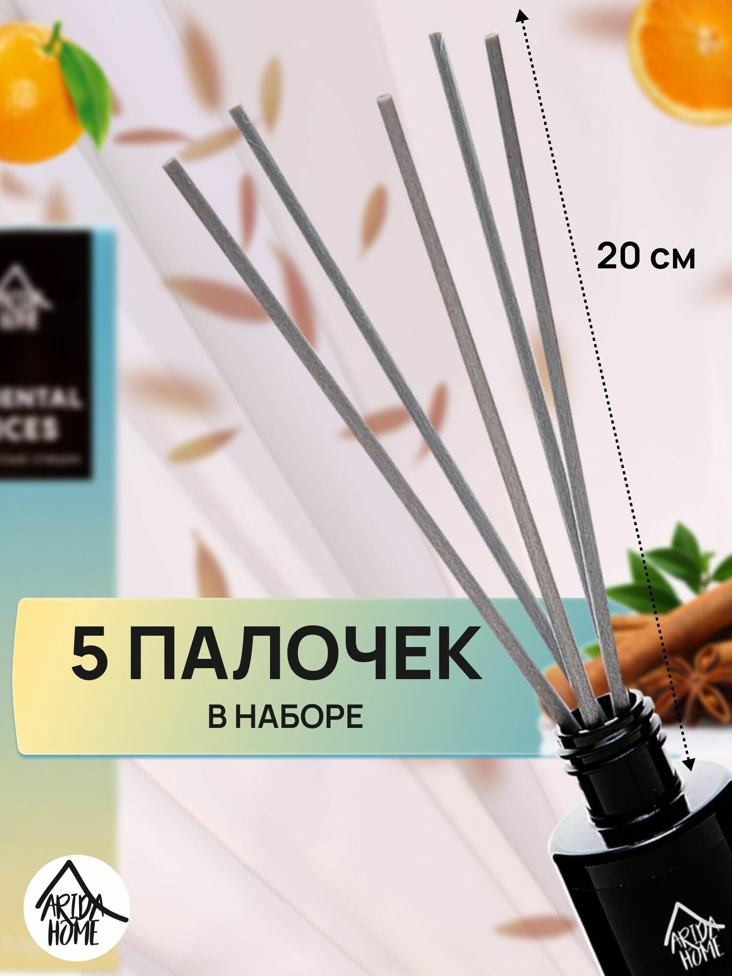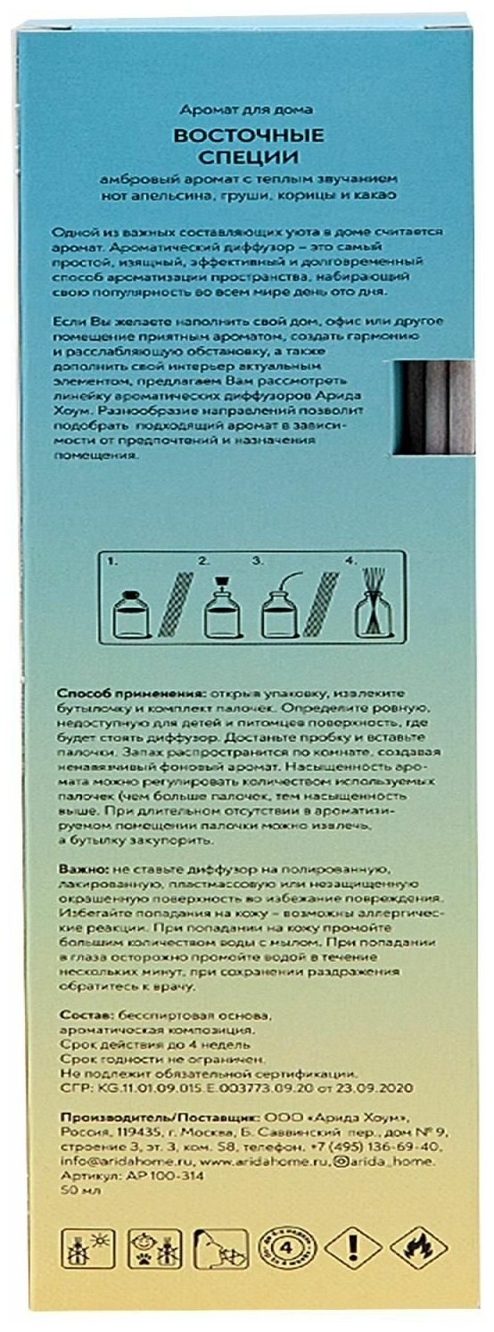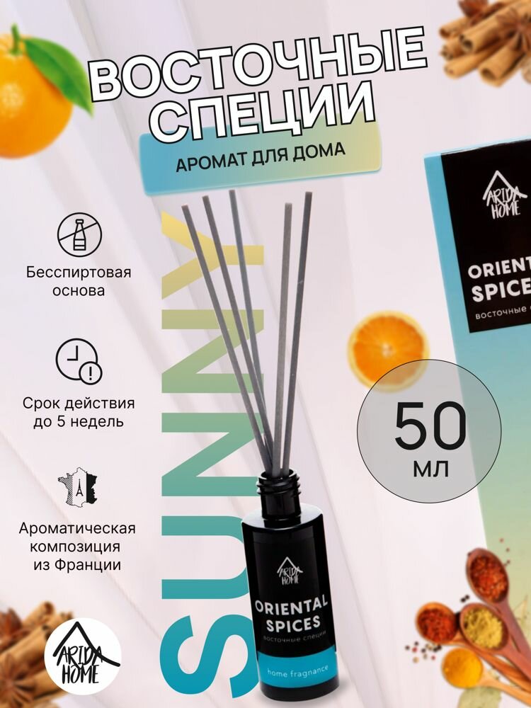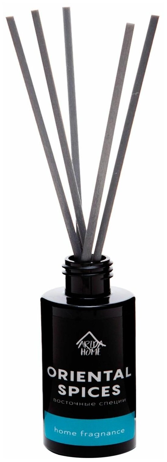 **Ароматический диффузор Arida Home** имеет пряный запах. Используется для ароматизации воздуха жилых помещений, офисов, административных учреждений. В комплект входят палочки, которые можно использовать по отдельности или все вместе.