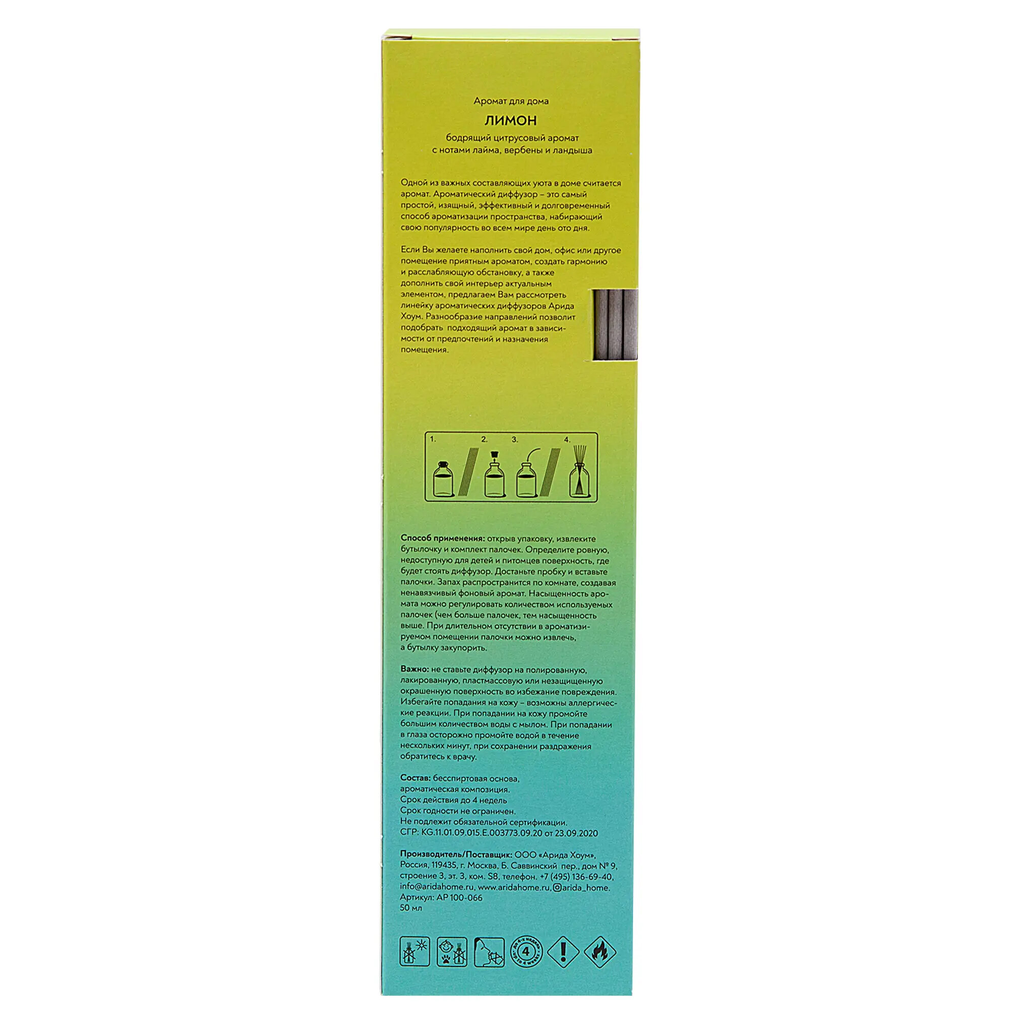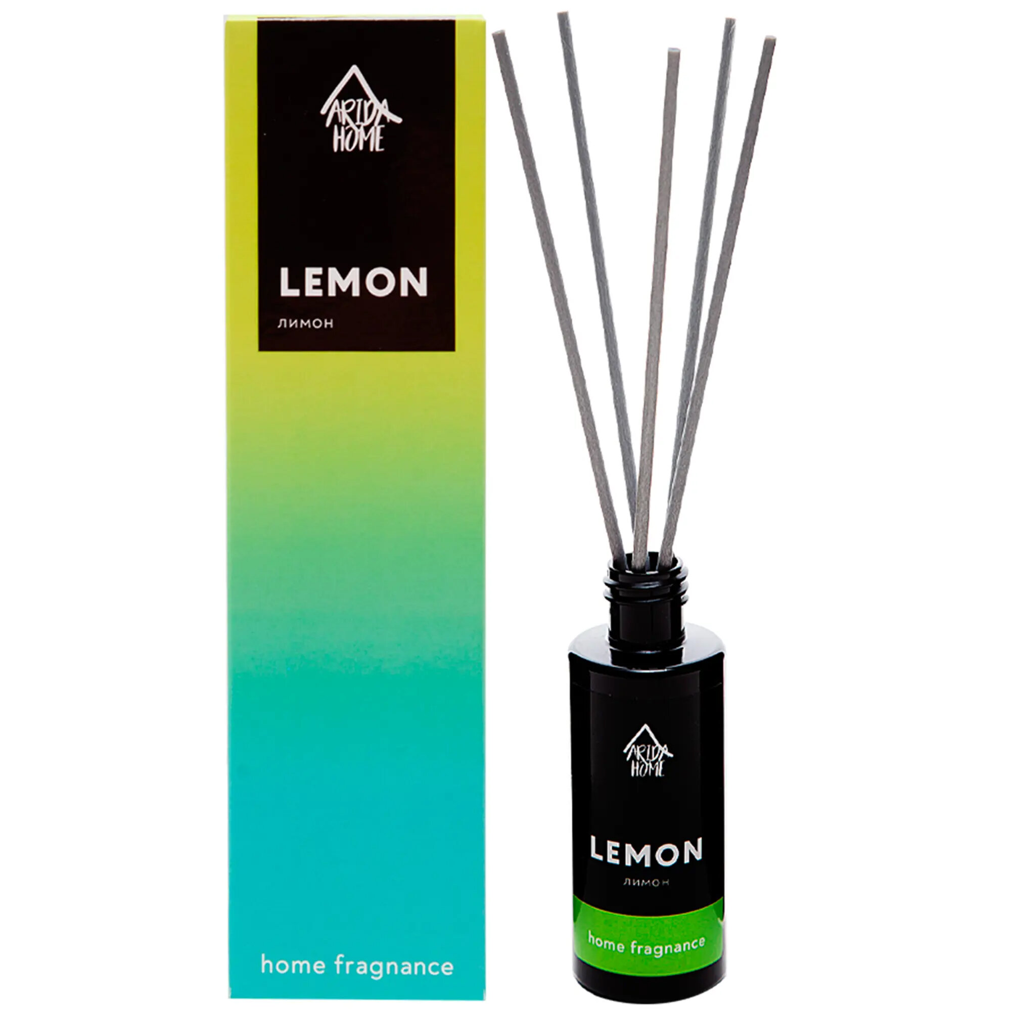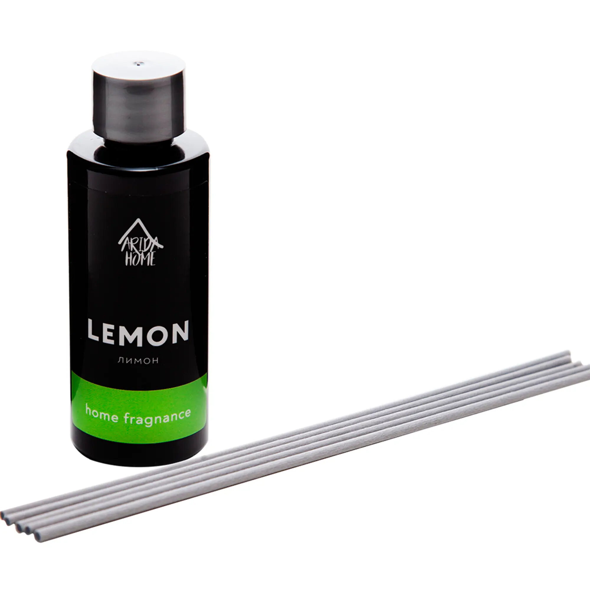 **Ароматический диффузор Arida Home** имеет лимонный запах. Используется для ароматизации воздуха жилых помещений, офисов, административных учреждений. В комплект входят палочки, которые можно использовать по отдельности или все вместе.