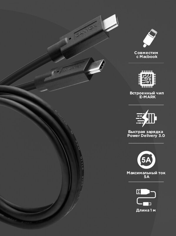 Этот кабель от Canyon с USB-C на USB-C можно использовать как для зарядки, так и для синхронизации устройств. Использует он стандарт USB 3.1, а это означает, что передавать аудио, видео и другие данные можно со скоростью до 5Гбит/с. Данная модель оснащена чип E-MARK, с ним по проводу может проходить вплоть до 100Вт. Он же обеспечивает безопасность во время использования кабеля. Мощностью в 100Вт распоряжается технология Power Delivery 3.0. Она решает, сколько ватт подавать, чтобы подключенное устройство зарядилось быстрее. Кстати, этот кабель можно использовать даже для зарядки MacBook Pro. Кабель с USB-C на USB-C; Стандарт USB 3.1; Скорость передачи данных - 5Гбит/с; Мощность - 100Вт; Длина - 1м.