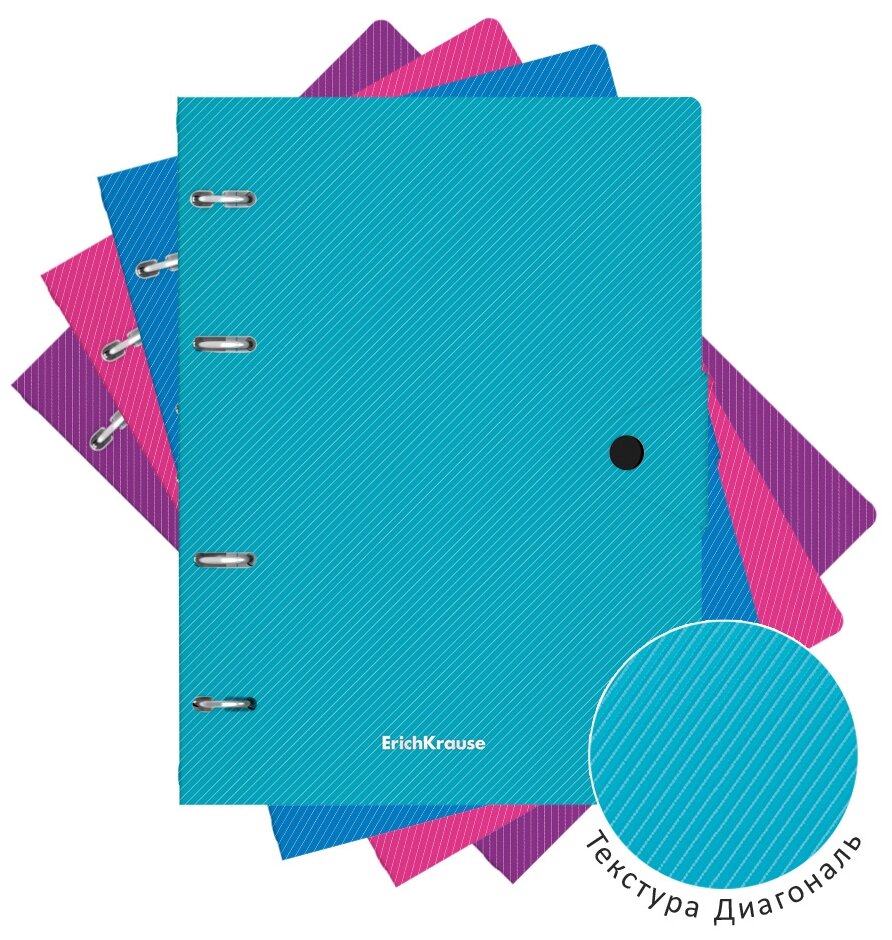 В комплекте 1 шт.Тетрадь общая формата А5 (147x205 мм). Характеристики: Обложка из высококачественного износостойкого глянцевого пластика с фактурой «диагональ». Яркие цвета обложки. В блоке 80 листов в клетку. Бумага офсетная плотностью 55 г/м2. Цвет линовки - синий. Скругленные уголки обложки. Тип скрепления - кольца. Обложка фиксируется клапаном с кнопкой. Прорези под кольца оснащены фиксаторами. Товар поставляется в нескольких вариантах цвета без возможности выбора.