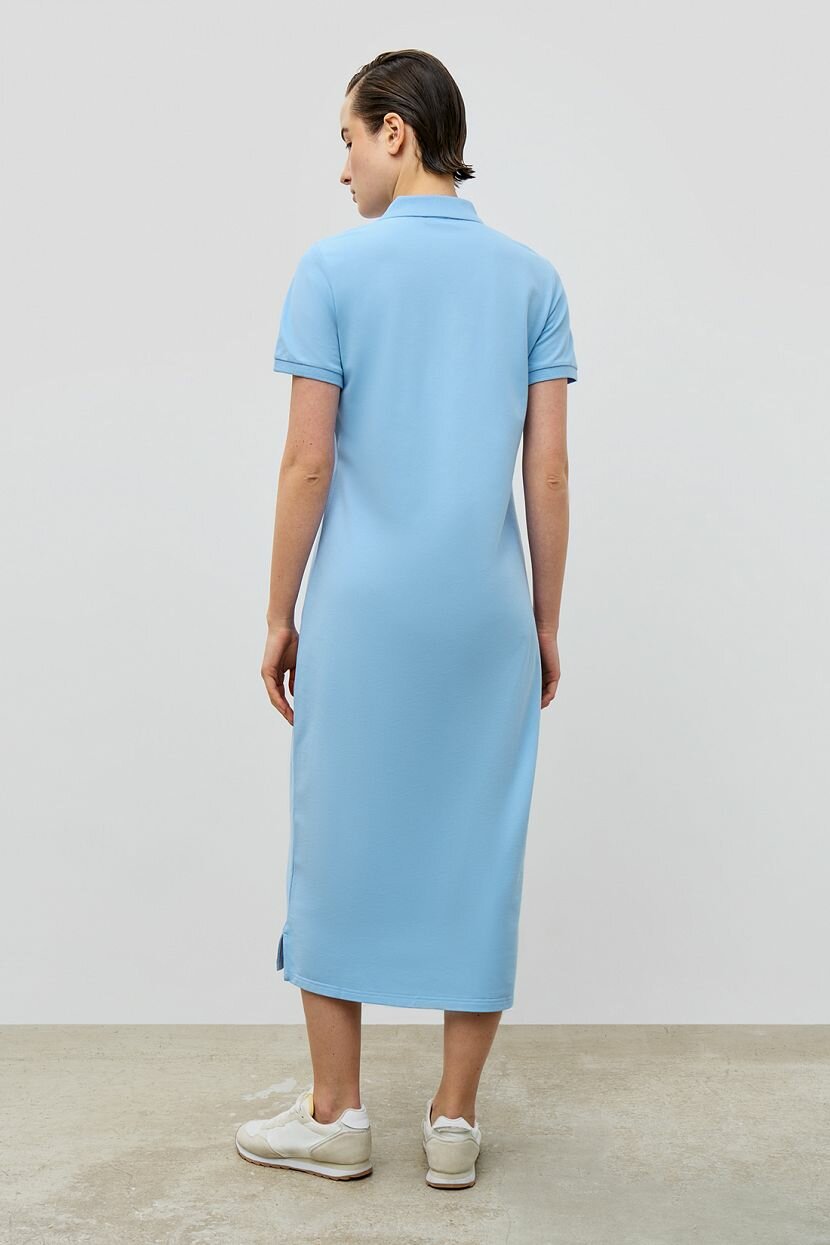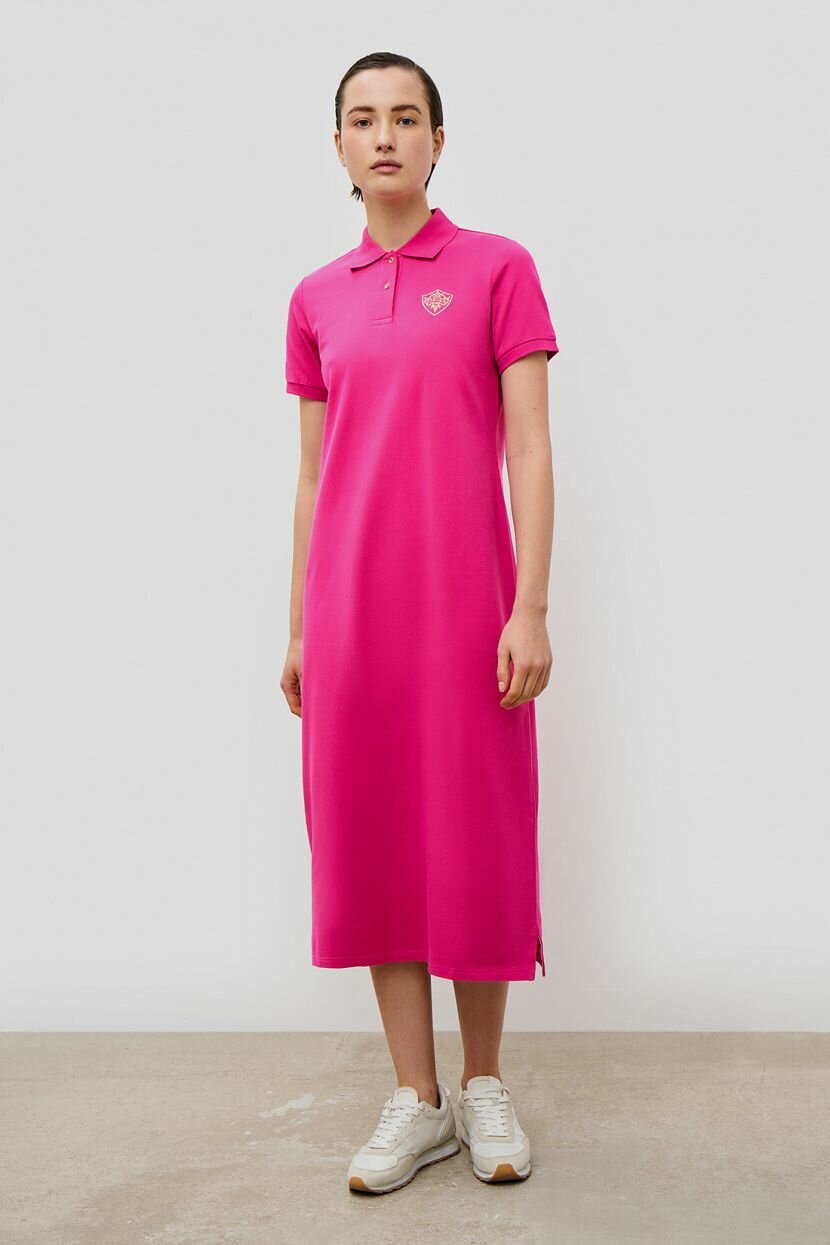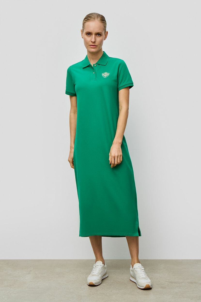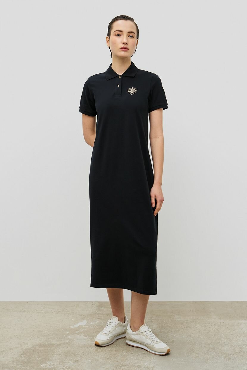Отличный вариант для жаркого лета - платье-поло в актуальной длине миди. Простое, лаконичное, но очень стильное, оно подчеркнет красоту вашей фигуры и подарит ощущение комфорта. Вышитая эмблема и фурнитура золотистого цвета стали акцентом базовой модели. Рекомендуем сочетать это платье с обувью в спортивном стиле.