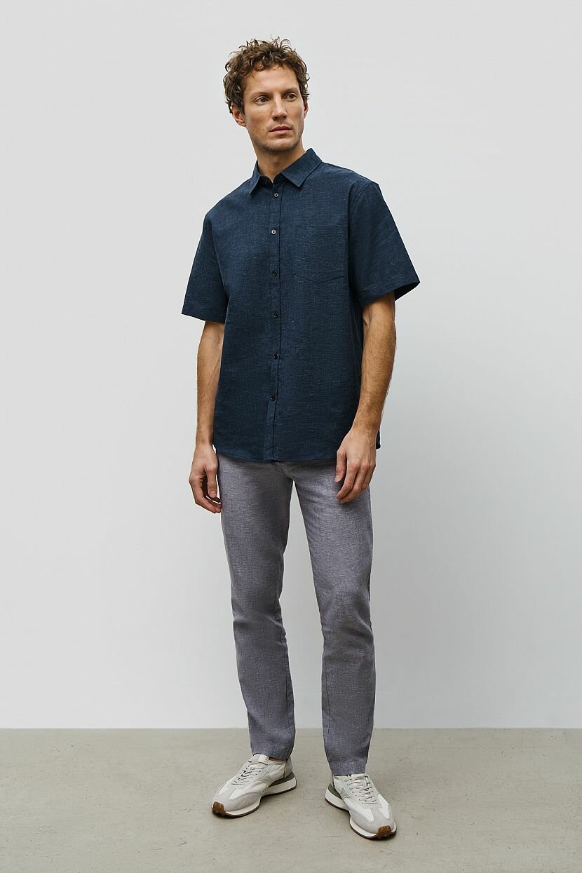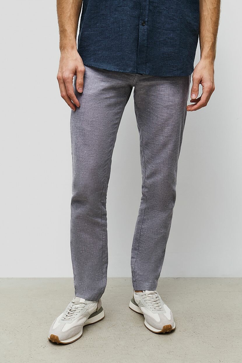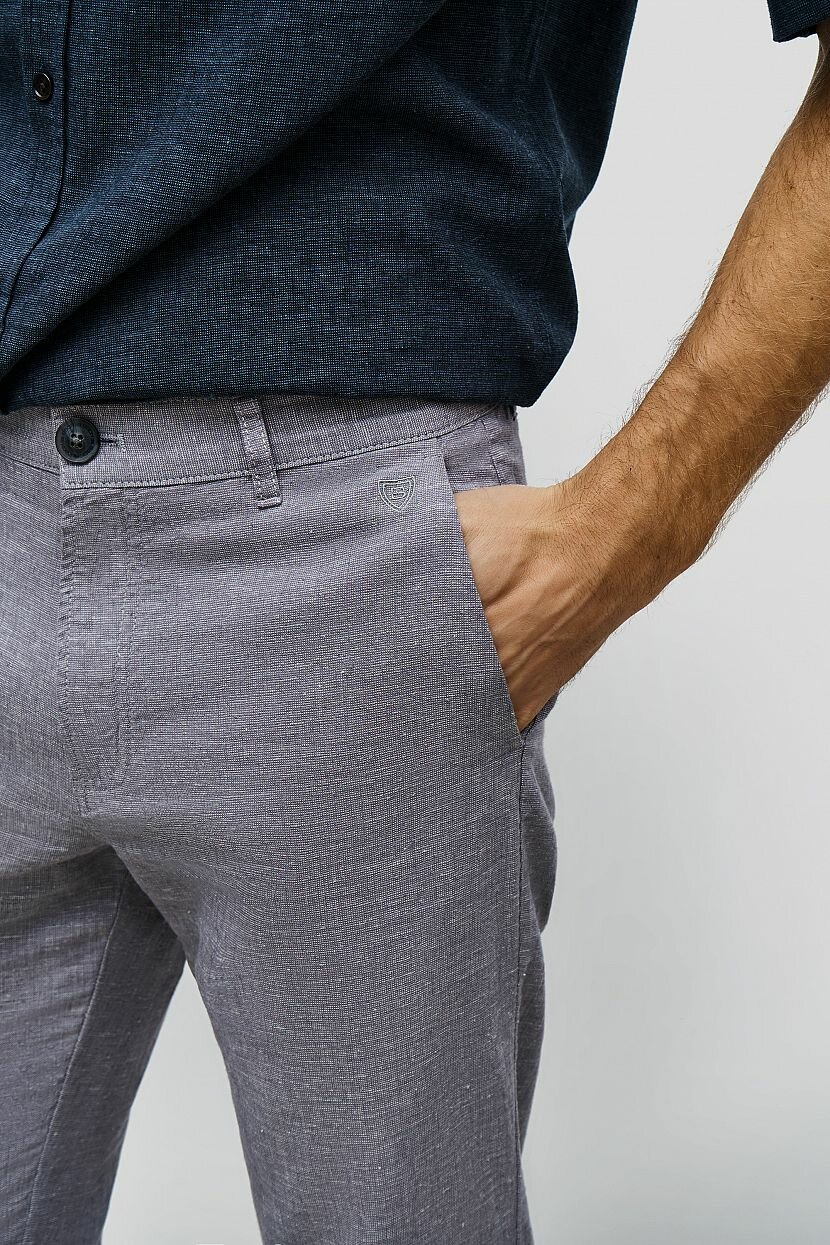 Брюки из смесового льна станут удачным выбором для лета в городе. Такую стильную модель можно использовать не только в повседневных, но и в деловых образах. Чтобы собрать элегантный костюм, обратите внимание на пиджак а для более непринуждённых образов - на рубашку что очень ценно в жаркую погоду. Материал прошёл смягчающую обработку. Брюки застёгиваются на молнию и пуговицу. Пояс дополнен шлёвками для ремня. По бокам расположены карманы, сзади имеются карманы с пуговицами.