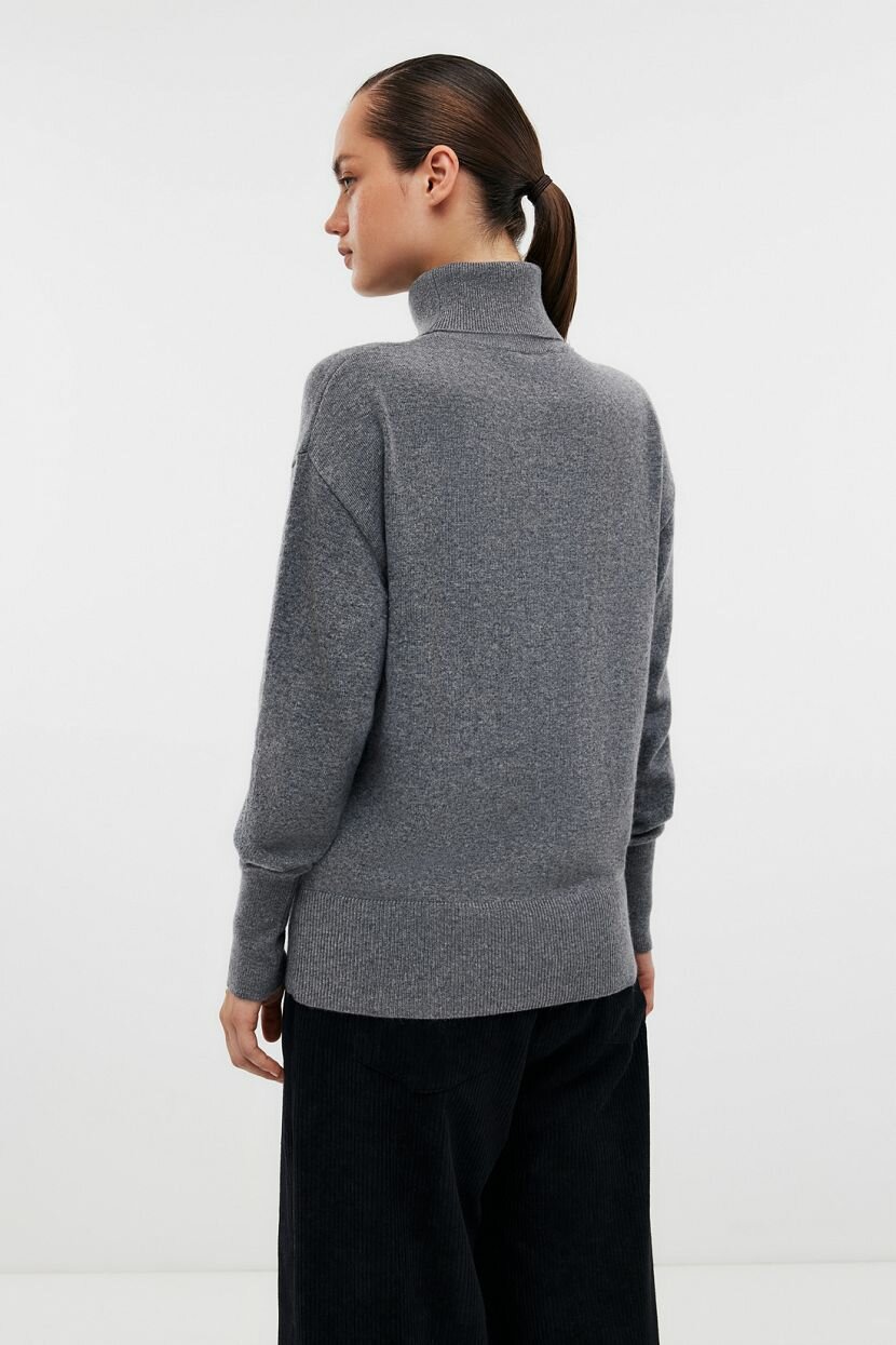 Водолазка выполнена из смесового трикотажа, устойчивого к износу и растяжению. Натуральная шерсть в составе позаботится о вашем комфорте и тепле. Модель имеет прямой крой и актуально спущенные линии пройм. Высокие манжеты, воротник с отворотом и нижняя часть изделия вывязаны эластичным рубчиком.