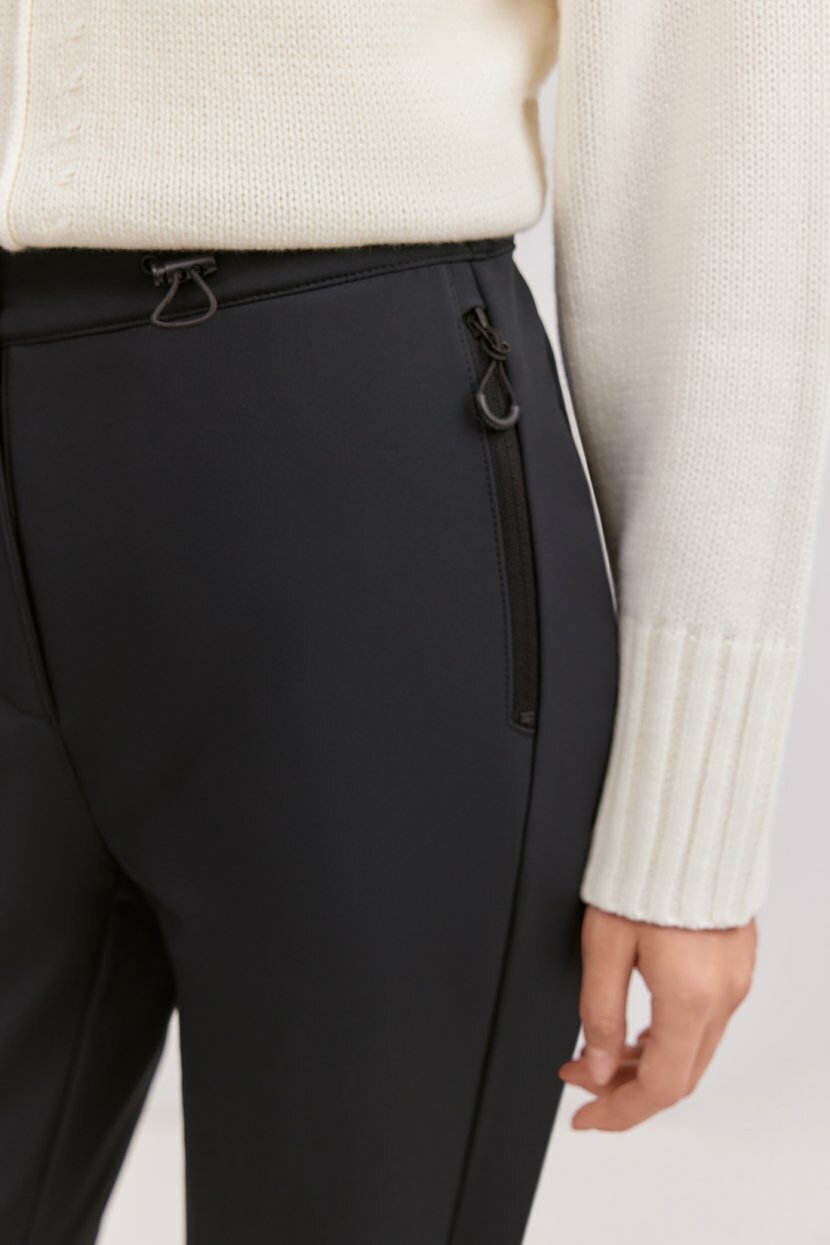 Внешняя поверхность материала бондинг представляет собой плотный трикотаж, а внутренняя - мягкий флис. Материал имеет влаго- и ветрозащитную обработку, которая также дополнительно уплотняет ткань. Брюки застёгиваются на молнию и пуговицу. Пояс дополнен кулиской с утяжками для комфортной посадки по фигуре. По бокам расположены карманы с молниями и эргономичными держателями. Штанины завершаются эластичными штрипками - в этом сезоне это не просто функциональная, но ещё и очень трендовая деталь.