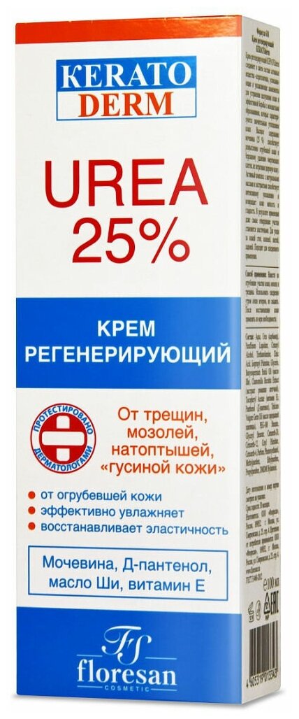 Крем регенерирующий КЕРАТОderm соединяет в своем составе активные вещества- кератолитики, успокаивающие и увлажняющие компоненты для устранения шелушения кожи и эффективной борьбы с мозолистыми образованиями, которые характеризуются значительным утолщением кожи. Высокое содержание мочевины (25 %) способствует разрыхлению огрубевшей кожи и бережному удалению омертвевших клеток, не затрагивая здоровую кожу. Активный комплекс с натуральными маслами и экстрактами способствует интенсивному увлажнению и возвращает коже мягкость и гладкость. В результате применения даже самые отвердевшие участки становятся эластичными. Подходит для ежедневного применения.