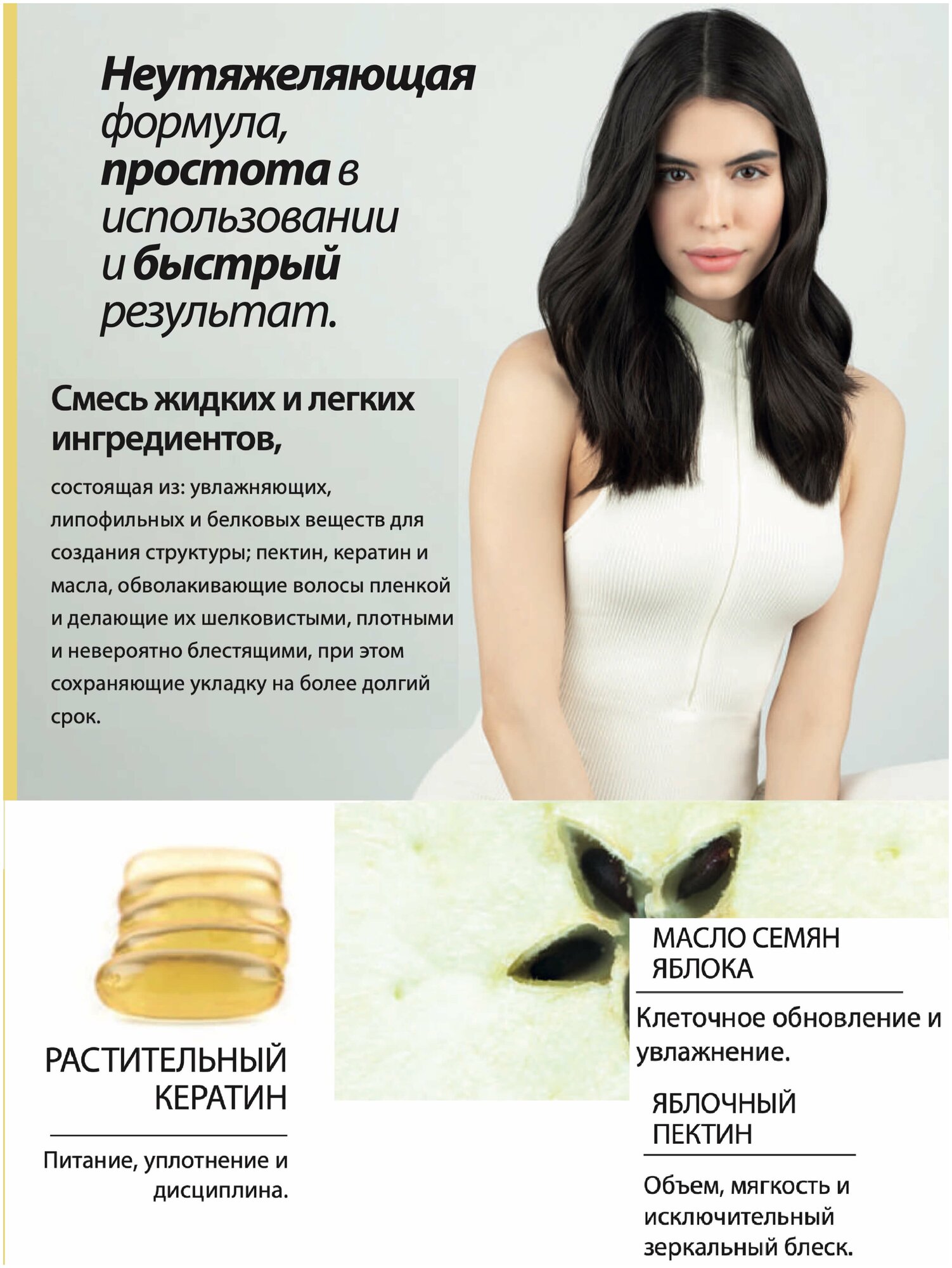 Разглаживает кутикулу и устраняет эффект пушистости, дисциплинируя, питая и защищая волосы. Придает волосам здоровый и ухоженный внешний вид.