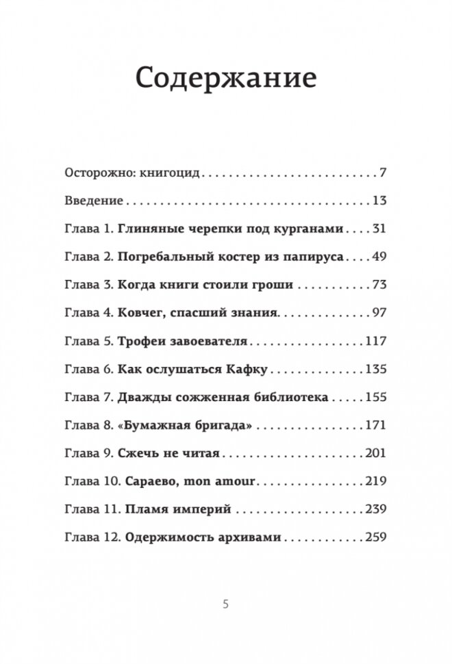 Автор книги рассказывает об огромном могуществе скрытом в книгах и письменности в целом и о потери и страшных последствиях, когда книги уничтожают. Книгоцид. Он начинает с этого и заканчивает этим свою книгу. Это и потеря культуры, и потеря знаний, стирание истории и истребление истины. А когда история забывается, то приходит необходимость прожить ее снова, со всеми ужасными подробностями или хуже. О таких случаях и рассказывает автор в своей книге, от античности и до наших времен. В наше время книгоцид идет полным ходом, хоть многие уже и знают этому цену. Это называется "цифровизация". Книги стали неудобными по сравнению с телефоном, который поместится у вас в кармане. Однако уничтожить или переврать цифровую информацию еще проще, чем сжечь книгу. Истина всегда будет объектом для атаки, войны нового уровня происходят через уничтожение истины. Книга читается очень легко, а главное действительно интересно и действительно полезно. Это важная пища для размышления для современного человека, особенно в такие сложные времена, которые мы сейчас проживаем. А дальше в таком же темпе, сами понимаете, будет только хуже.