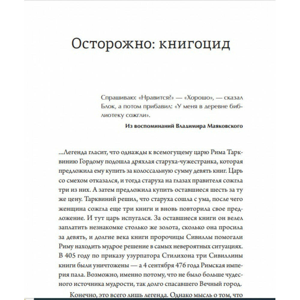 Автор провёл большое исследование о уничтожении книг от древности до наших дней. Книга читается с большим интересом.