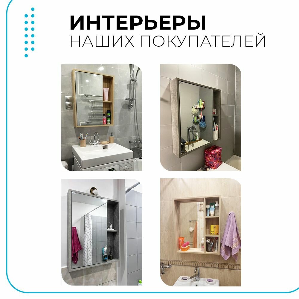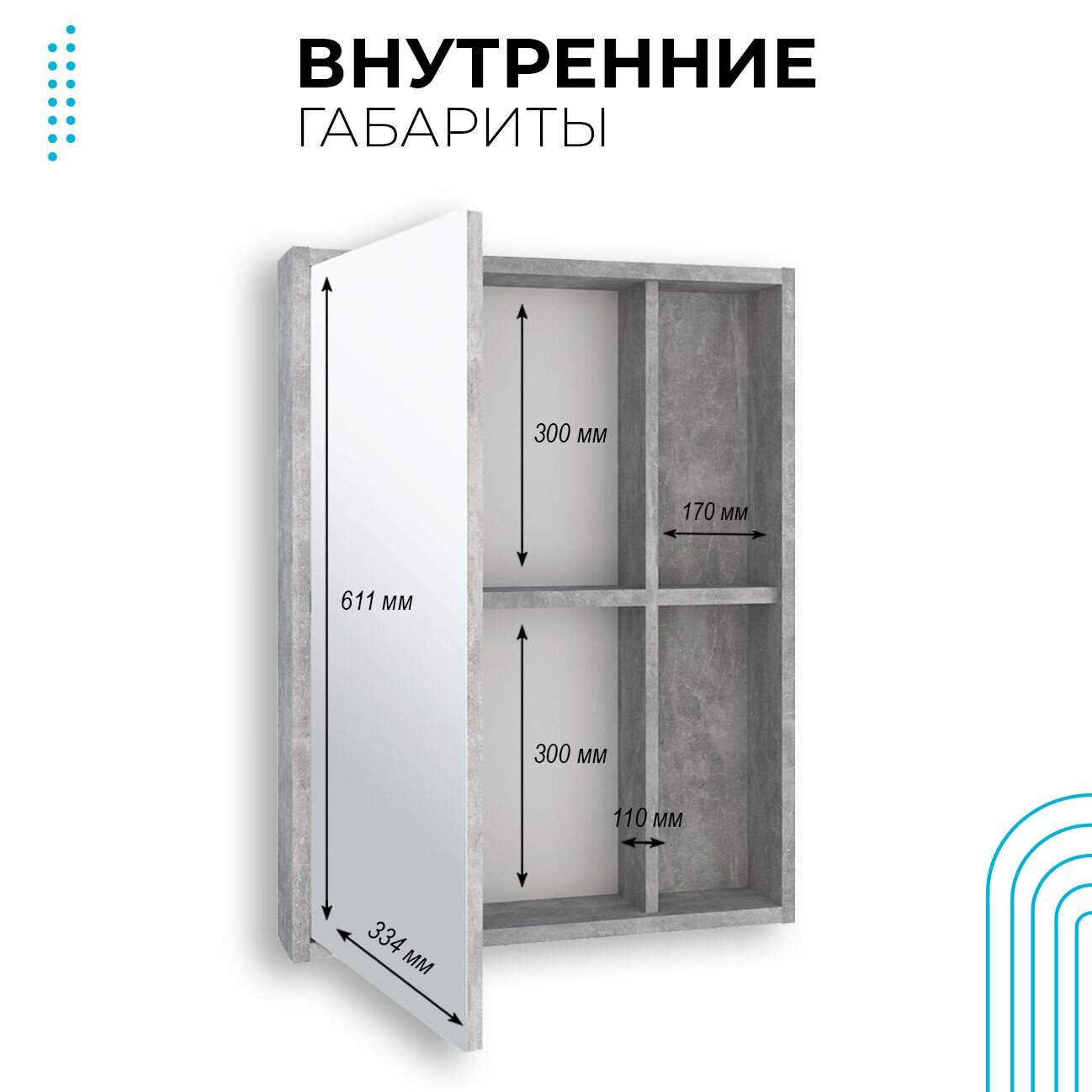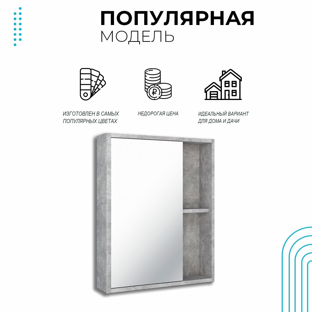 Зеркальный шкаф Runo Эко 00-00001184 серый бетон, стильное сочетание текстуры серого необработанного бетона на корпусе из МДФ. Шкафчик в ванную имеет одну распашную дверцу с зеркальным фасадом и две открытые полки. Шкаф в ванную - универсальный (для смены ориентации изделие поворачивается на 180 градусов). Внутри шкафа - одна внутренняя полка.