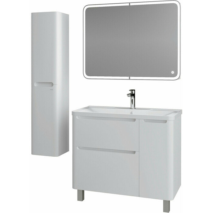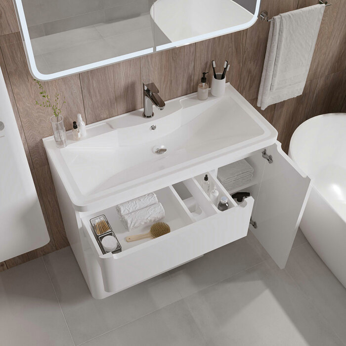 Тумба под раковину Grossman Адель 100 1010002 в белом глянцевом цвете, интегрированные ручки добавляют современный дизайн и строгий стиль. Тумба снабжена двумя ящиками и дверцей, укомплектованые системой плавного закрывания и предназначены для хранения различных предметов. Тумба выполнена из влагостойкого МДФ покрытая белой глянцевой краской, устойчивая к перепадам температур и высокой влажности, крепится к стене. Ручки и подвесы для крепления тумбы - в комплекте.