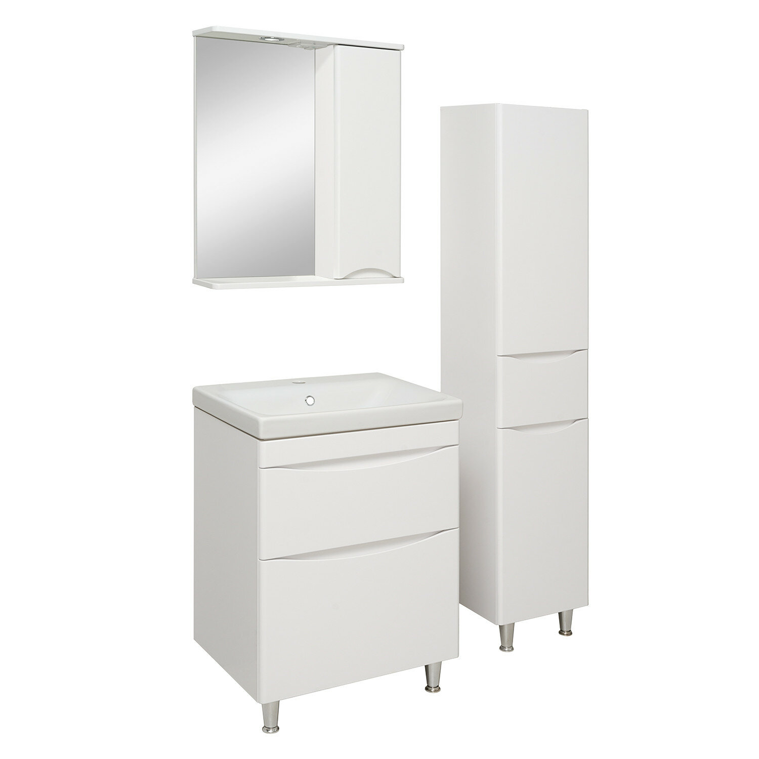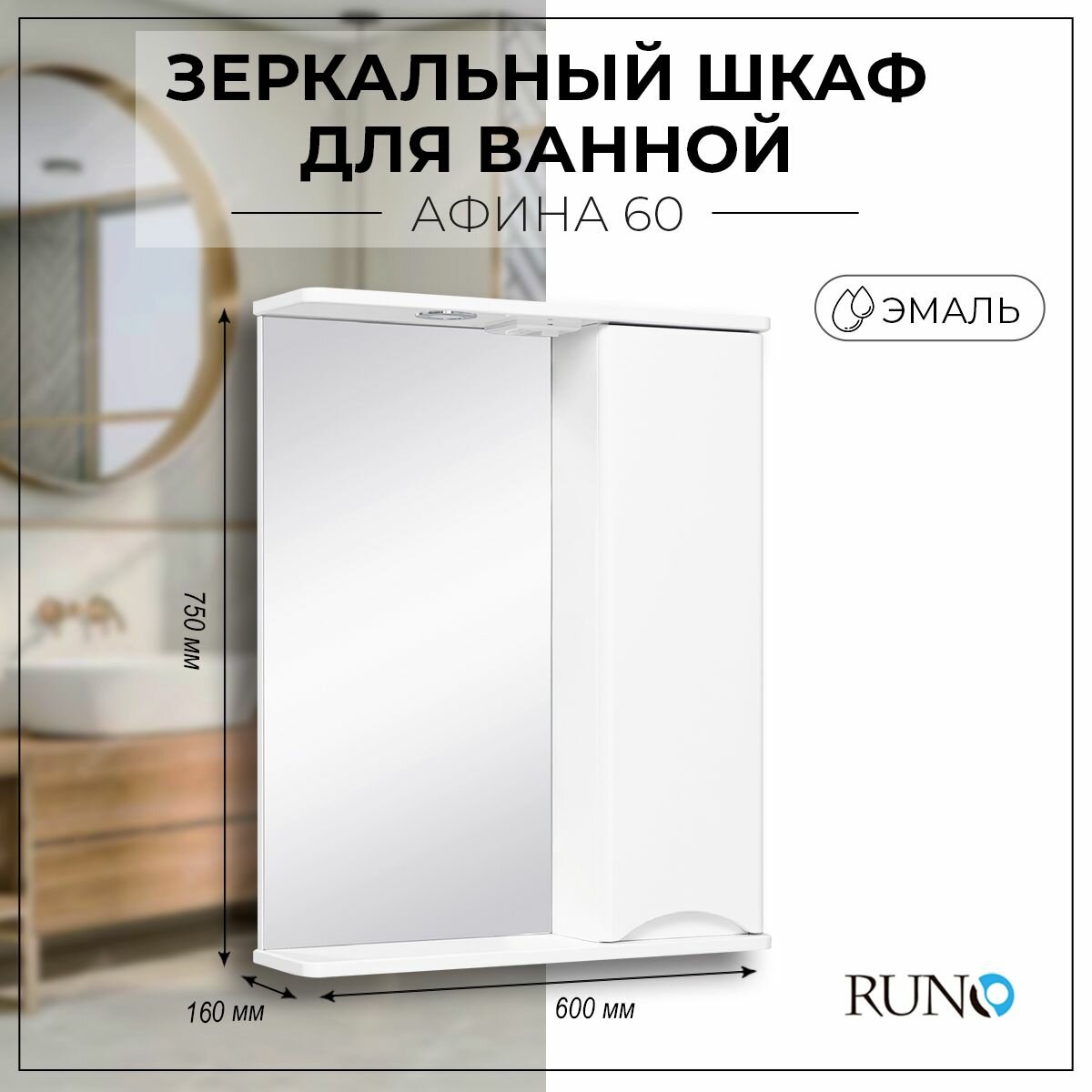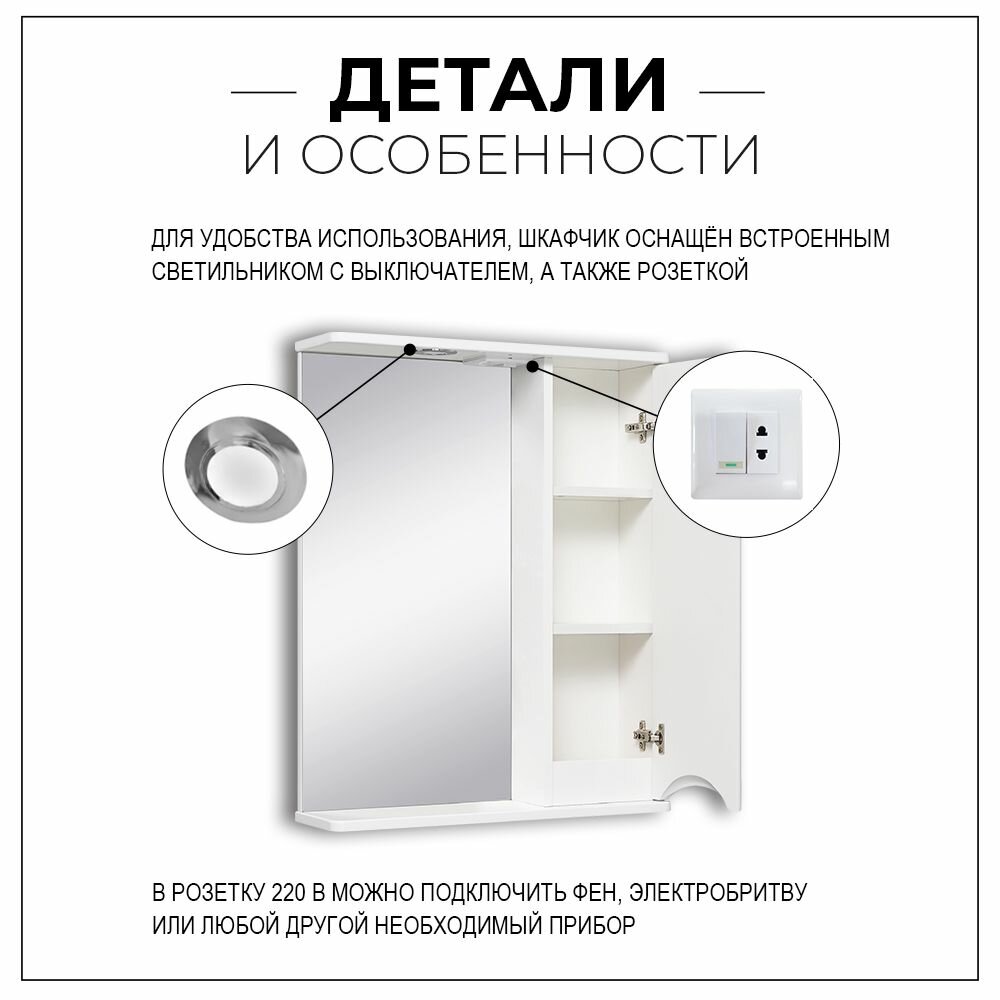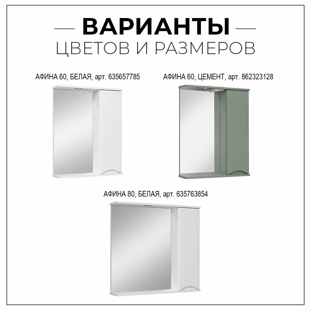 Зеркальный шкаф Runo Афина 00-00001171 белый, представляет собой зеркало настенное (слева) и шкаф в ванную с одной дверцей (справа). В шкафу имеются две внутренние полки. Шкаф для ванной оборудован одним врезным светодиодным светильником 220В и розеткой с выключателем. Шкафчик в ванную комплектуется петлями со встроенным доводчиком и ручкой. Зеркало с подсветкой , полка для ванной , зеркало с подсветкой в ванную , полка в ванную , полки для ванной , зеркало в ванную с подсветкой , мебель для ванной комнаты