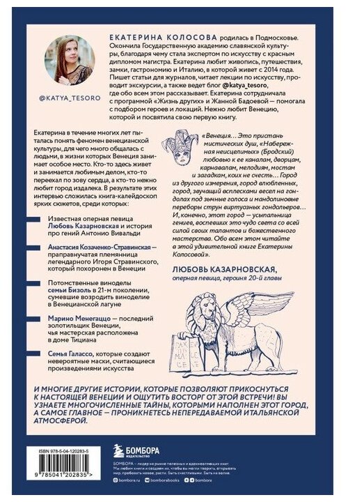 "Венеция... Это пристань мистических душ, "Набережная неисцелимых" (Бродский) любовью к ее каналам, дворцам, карнавалам, мелодиям, мостам и загадкам, коих не счесть... Город из другого измерения, город влюбленных, город, звучащий всплесками весел на гондолах под зычные голоса и мандолиновые переборы струн виртуозных гондольеров… И, конечно, этот город - усыпальница гениев, воспевших это чудо света со всей силой своих талантов и божественного мастерства. Обо всём этом читайте в этой удивительной книге Екатерины Колосовой". - Любовь Казарновская, оперная певица, героиня 20-й главы