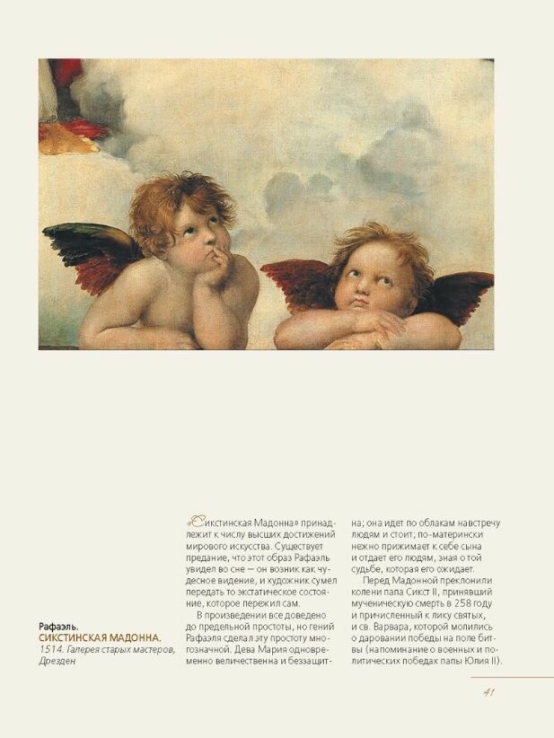 Брала на подарок девочке-подростку. Книга очень достойно выглядит, чего не ожидала, судя по цене. Понравились страницы: глянцевые, как в альбомах, не бликуют, рамки нарядные, но спокойные, в глаза не бросаются, гармонично дополняют текст и иллюстрации. По содержанию: художники представлены очень широко, у большинства известных включены несколько произведений, при этом понравилась репрезентативность подборки: картины подобраны по возможности из разных жанров (стилей), в котором работал художник. Справочные статьи лаконичные, но не сухие. Не будучи человеком искусства, считаю, что книга для широкого круга читателей выполняет свою функцию - приобщение к прекрасному, при этом она достаточно энциклопедична по количеству представленных работ.