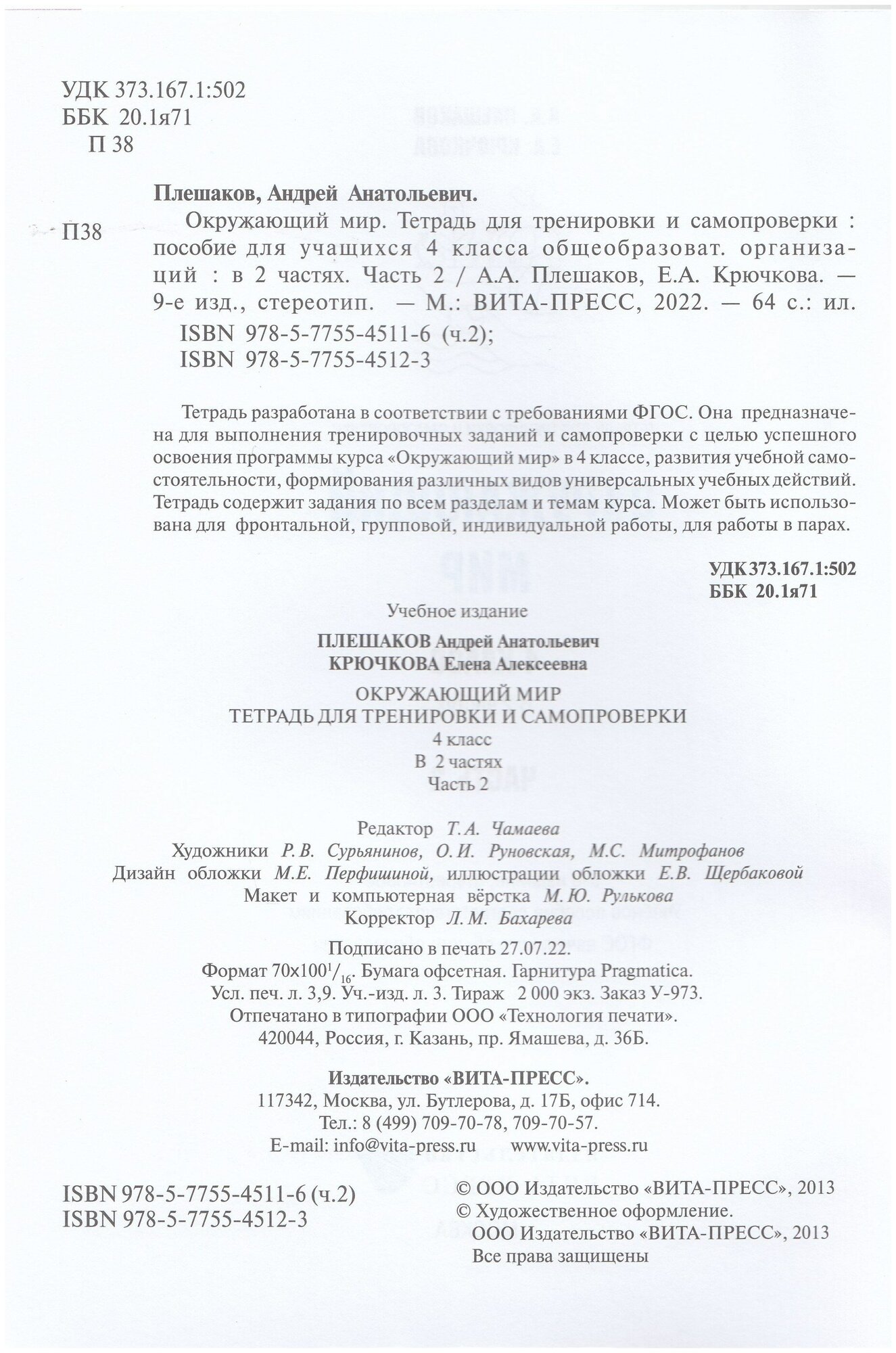 Окружающий мир. 4 класс. Тетрадь для тренировки и самопроверки. В 2 частях. Часть 2 (Плешаков Андрей Анатольевич, Крючкова Елена Алексеевна); Вита-Пресс, 2022
