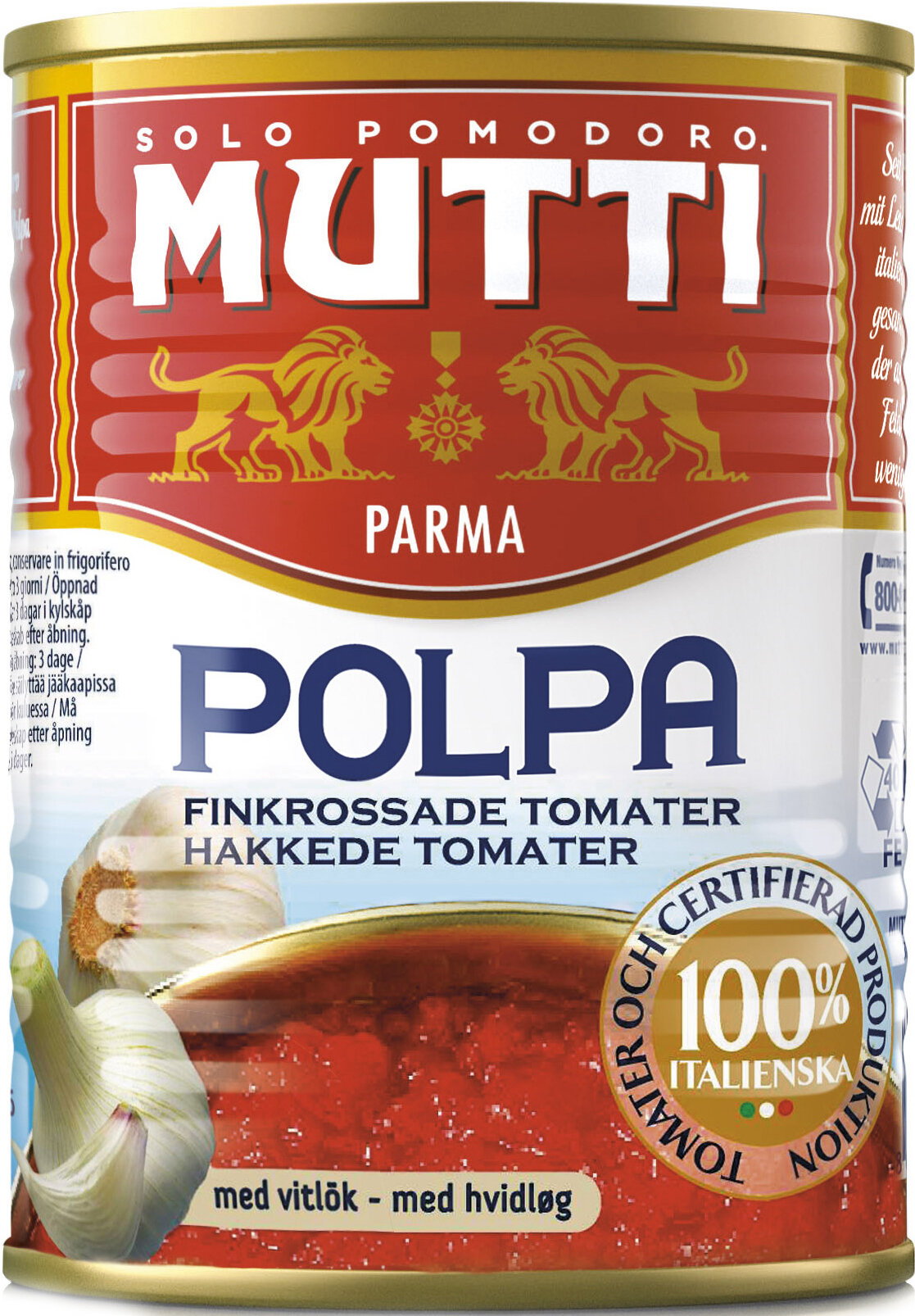 Томаты резаные кубиками в томатном соке с чесноком " Мутти" изготавливаются без использования добавок и консервантов, что позволяет продукту сохранять оригинальные органолептические качества. Высокая однородность продукта позволяет ему равномерно смешиваться с блюдом и подчеркнуть вкус основного блюда. Томаты Polpa используются как для приготовления горячих блюд, так и в сыром виде. Идеально сочетается с макаронными изделиями, благодаря насыщенному вкусу, Polpa идеально подходит для приготовления блюд в духовке. История компании " Мутти" началась в 1899 году, в регионе " Эмилия Романья", которая с давних времен славится своей изысканной кухней. Компания " Мутти" – производитель, прошедший путь от небольшой сельскохозяйственной фабрики до крупного производителя с мировым именем благодаря высшему качеству продукции и любви к своему делу. " Превознести томат до самых его вершин…" - в этой фразе раскрывается суть компании Мутти, поэтому сегодня, также как и в прошлом, с той же страстью и вниманием семья Мутти производит высококачественную продукцию, разрабатывая новые рецепты и совершенствуя вкус томатов. Семьей " Мутти" придумана томатная паста в тюбиках, томатный уксус, первыми были выпущены на рынок резанные кубиками томаты (polpa), секрет производства которых держится в строжайшей тайне. Компания " Мутти" стала первой среди производителей выпускать всю продукцию под знаком " интегрированная и сертифицированная продукция". " Pomodorino d'Oro" - приз за лучший урожай.