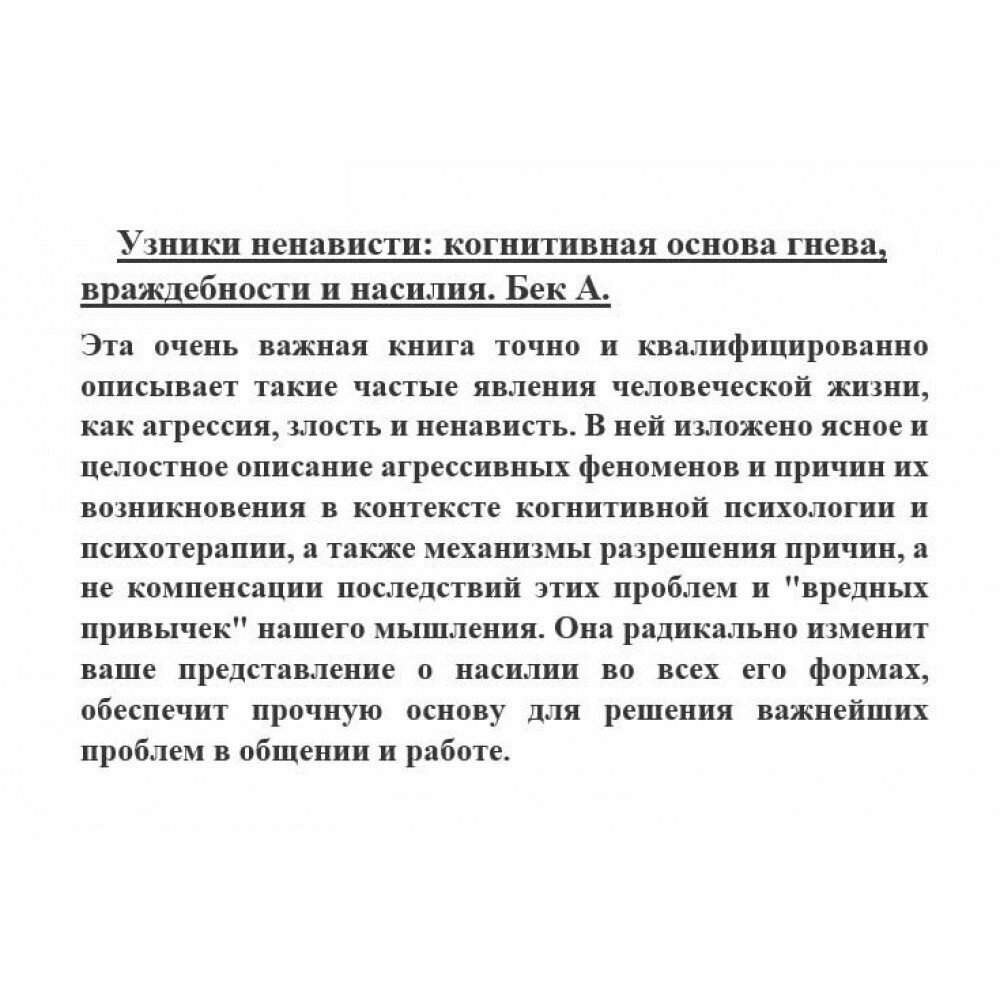 Книга еще не дочитана, но я уже в восторге. Читаю вдумчиво и внимательно. Взгляд на агрессию и гнев с точки зрения КПТ прекрасен тем, что ситуация выглядит более управляемой. В книге есть описания конкретных случаев, глубинных убеждений, влияющих на проявлений таких реакций. Это не книга-помощник, но внимательный читатель легко поймет, как можно помочь как минимум себе и будет лучше понимать других. Удивительно, насколько мало враждебность может иногда зависеть от действий другой стороны. Иногда связи просто нет. По-моему, полезно всем.