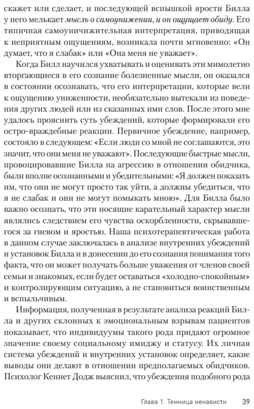 Не смотря на то, что книга написана профессором психотерапии она проста и понятна для обычного читателя. Эта книга источник понимания природы злости ненависти и агрессии, здесь описаны конкретные примеры с помощью которых появится понимание как бороться и противостоять этим эмоциям.