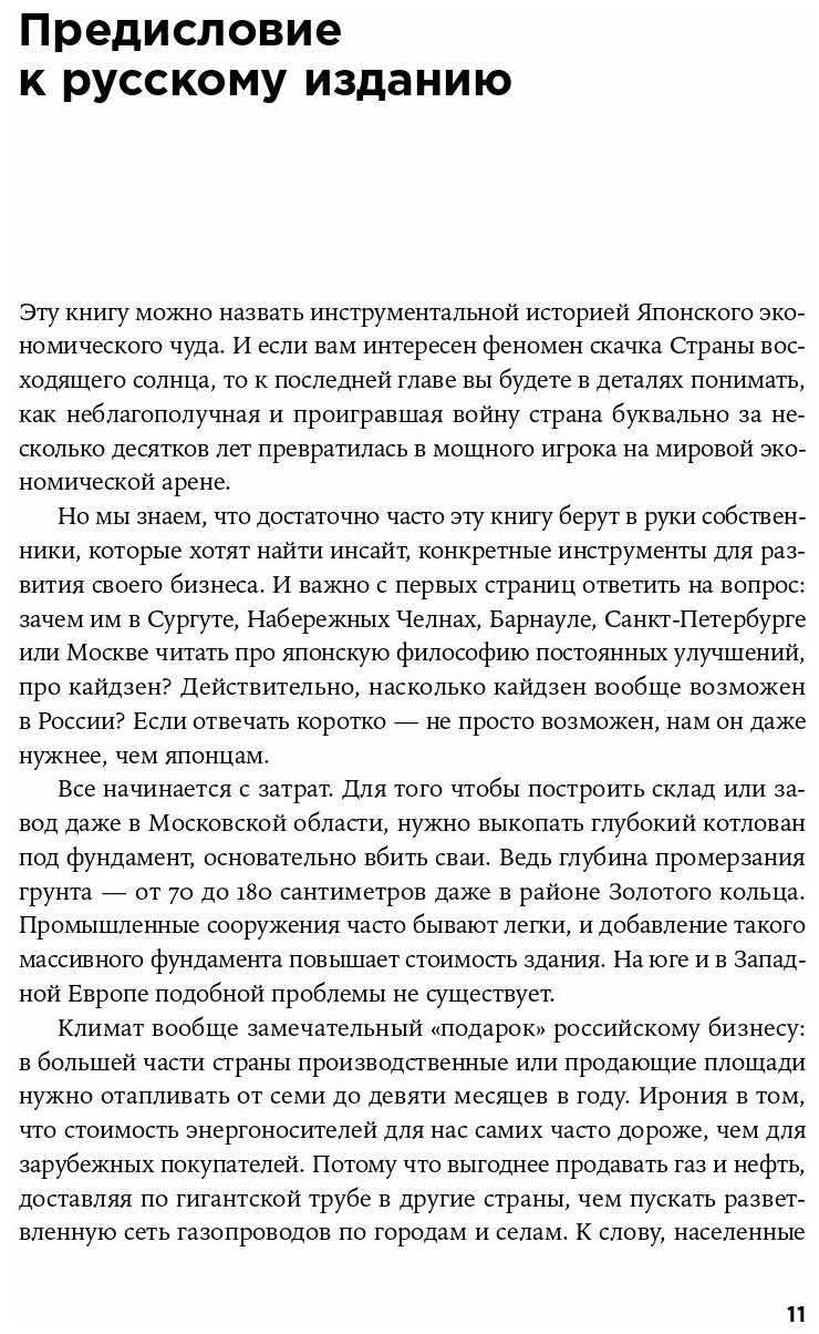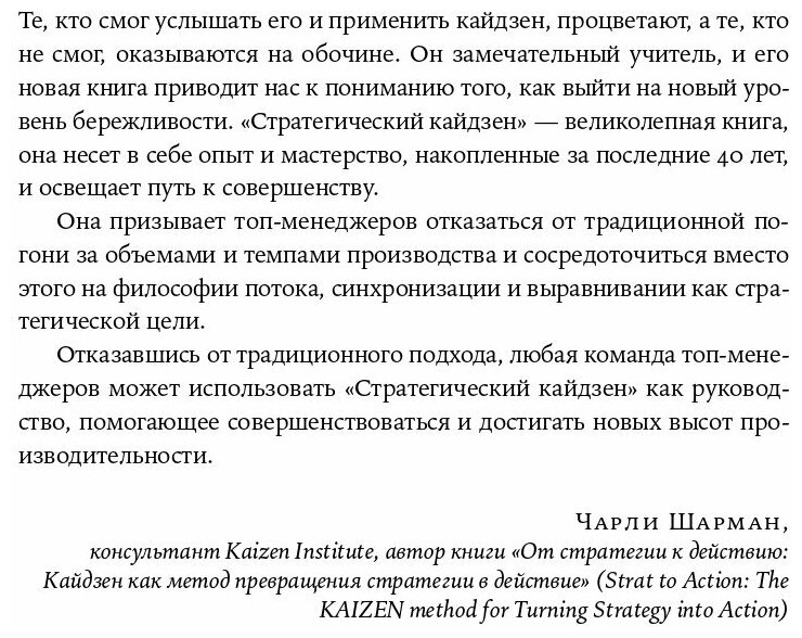 Отличная книга и очень своевременная. Это уже третья книга Имаи, которую я читаю. В принципе, можно начинать и с нее, хотя, конечно, в первой книге, «Кайдзен», изложены основы. В этой больше автор сосредоточился на практике, в ней много кейсов из реальной практики. Сейчас книга, наверное, особенно актуальна: потому что во время кризиса обязательно надо пересматривать и актуализировать стратегию развития компании. И именно кайдзен может стать ключом к выходу из ситуации. Ведь он помогает добиться максимального результата с минимальным использованием ресурсов, что важно сейчас как никогда прежде.