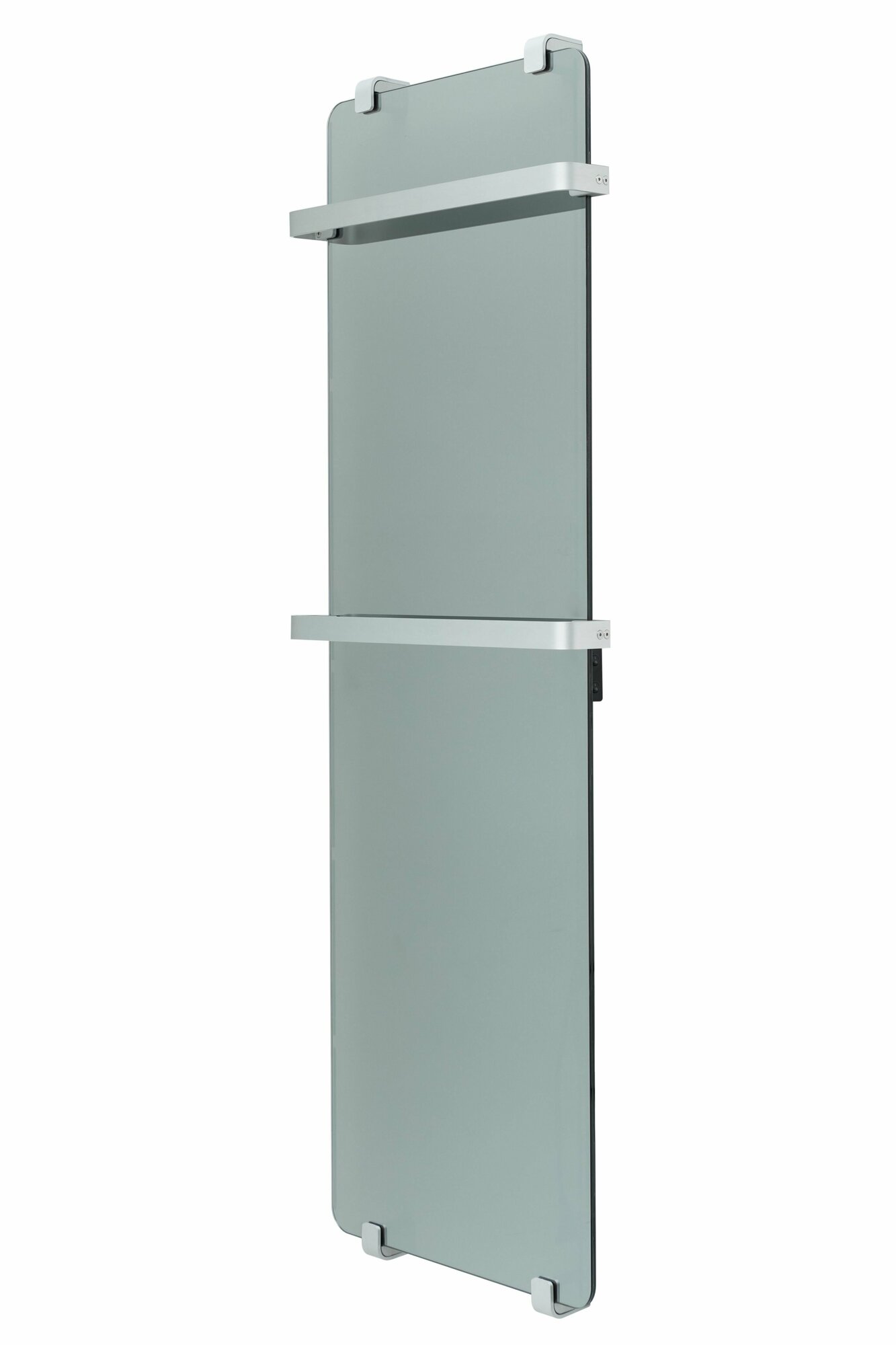Электрический полотенцесушитель Allen Brau INFINITY 140х44 8.21004.GL зеркальный. Технические характеристики: Электрический полотенцесушитель. Зеркальный корпус (4мм+4мм триплекс, токопроводящее напыление). Элементы фурнитуры из брашированного анодированного алюминия. Принцип работы: 80% - инфракрасное излучение, 20% естественная конвекция. Как это работает: На стекле нанесено специальное напыление которое проводит электрический ток. При прохождении тока сквозь напыление происходит нагрев поверхности. Поверхность стекла начинает испускать инфракрасное излучение. Происходит нагрев не только зеркальной поверхности полотенцесушителя но и остальных поверхностей в ванной комнате. Безопасность: Класс защиты IP54. 2-х зонный нагрев (Верхняя часть до 90 С | Нижняя часть до 60 С)