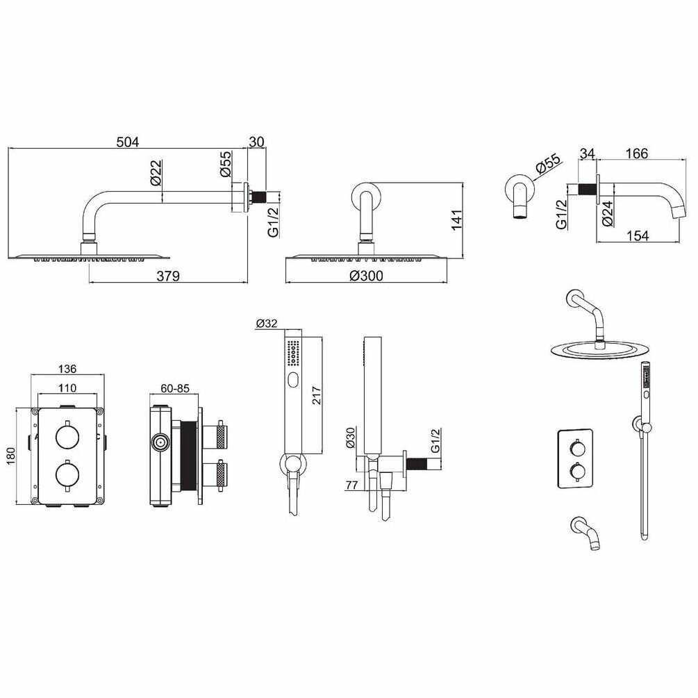 | Оснащение | Душевая лейка / Шланг для душа / Держатель душа / Кронштейн для верхнего душа / Шланговое подключение / Излив / Скрытая монтажная часть / Верхний душ / Смеситель |