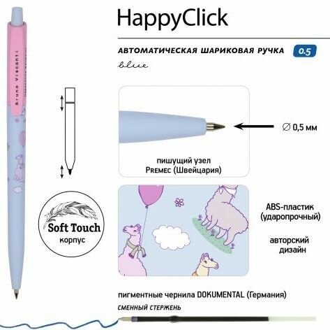 Тактильно приятная, имеющая надежный и простой нажимной механизм с бесперебойной подачей стержня, ручка «HappyClick» от Bruno Visconti станет неизменным помощником в учебе и работе.
