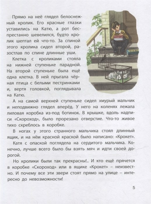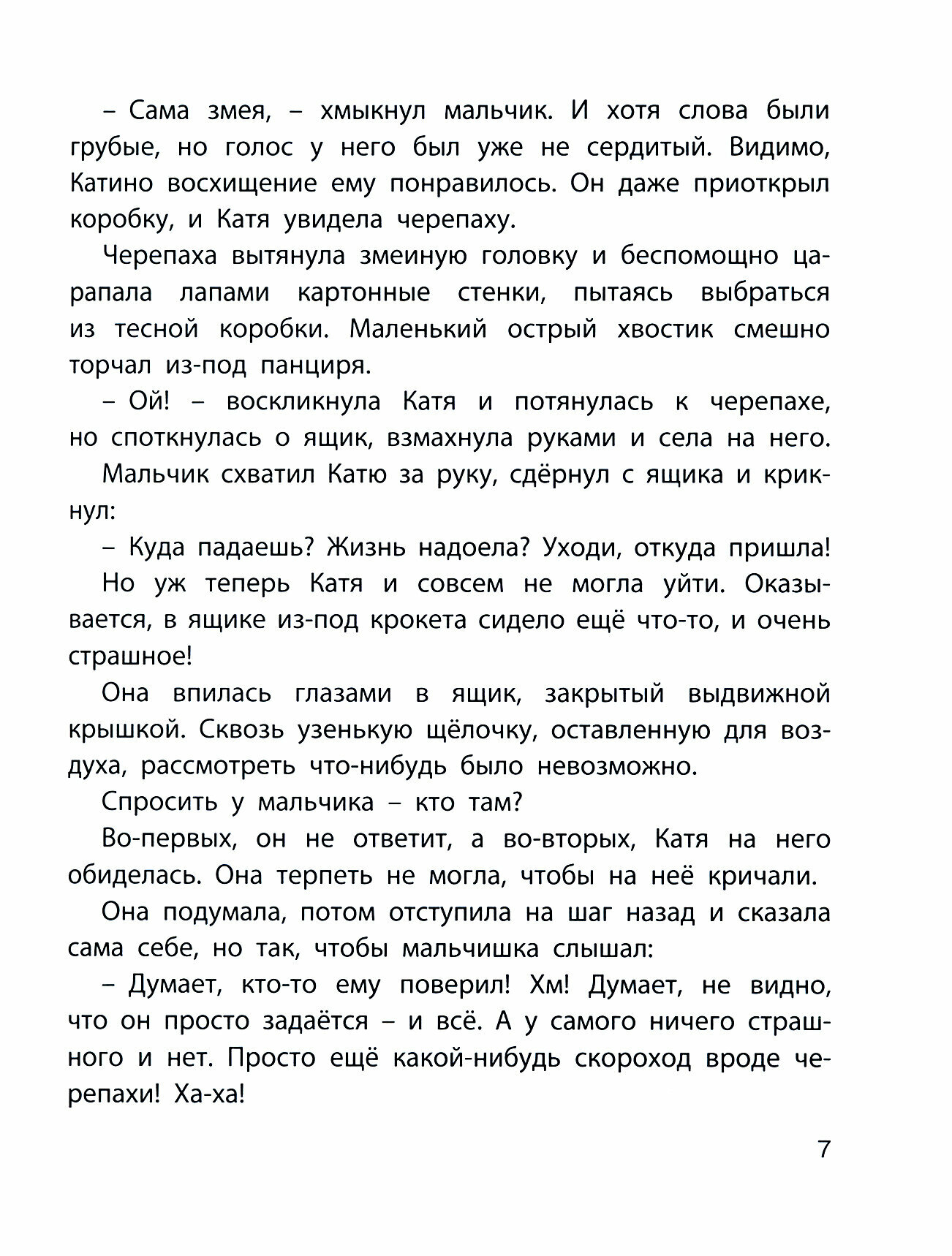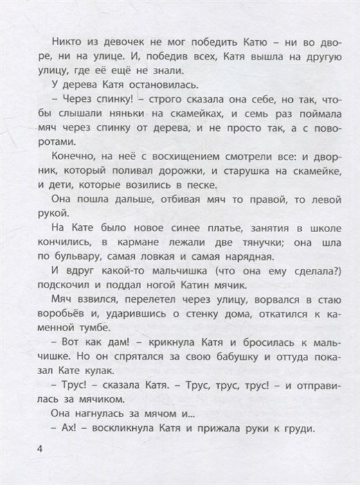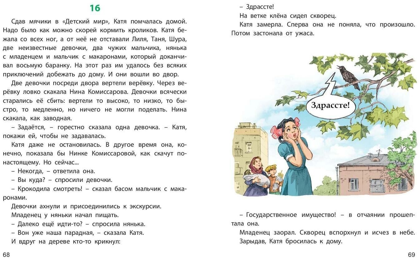 Отличная книга о приключениях девочки Кати. Одна из самых любимых детских книг.Написана очень легко, простыми словами, ребенком может быть прочитана без дополнительных пояснений родителей.Очень интересный и увлекательный сюжет,даже взрослому хочется узнать, чем закончится история. О дружбе, о животных, о детских переживаниях.Очень рада, что любимые книги из моего детства читают с удовольствием мои дети.Красочное издание дополняет прекрасное содержание.