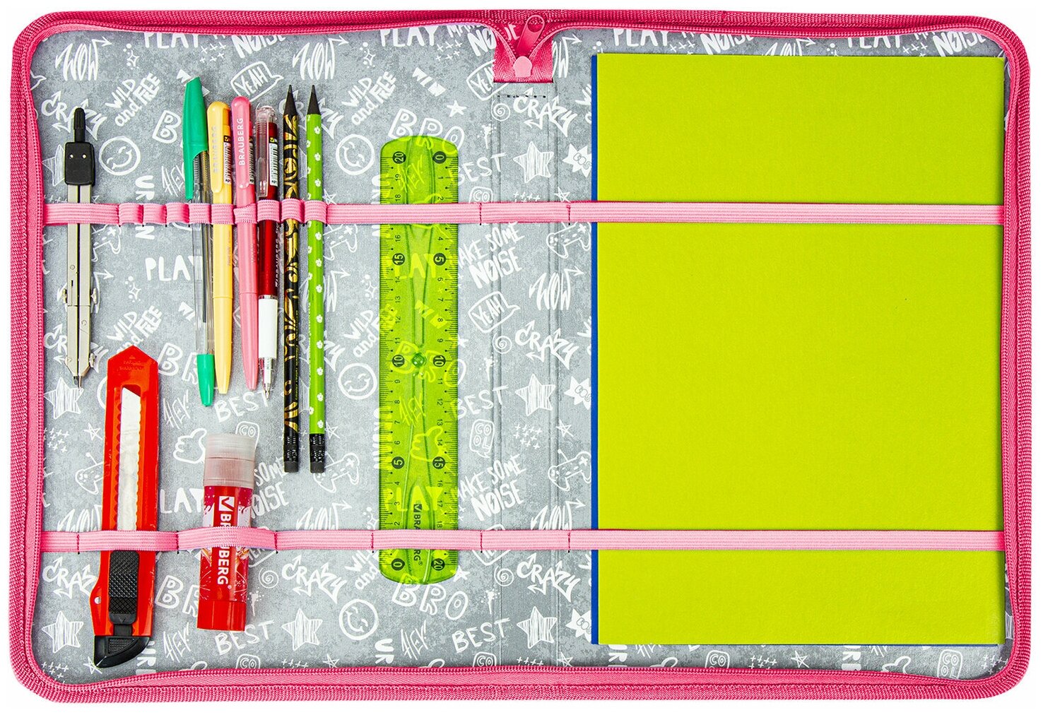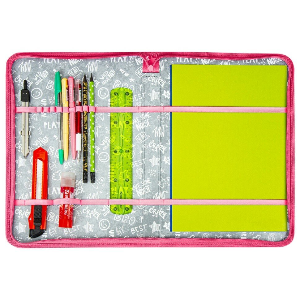 Тканевая папка для труда BRAUBERG с ручкой. Внутри папки крепления для канцелярских и письменных принадлежностей. Застежка-молния расположена по периметру папки.