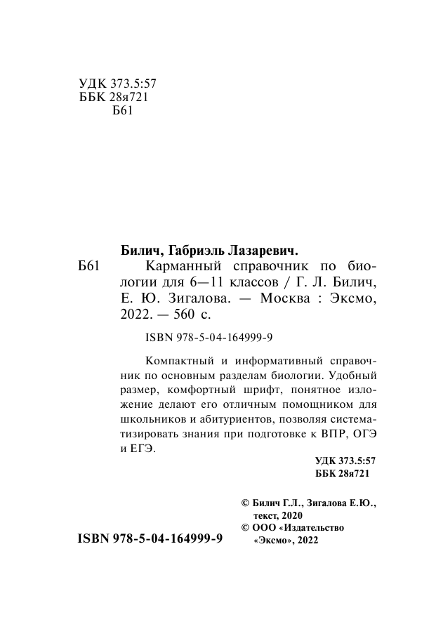 Сервис сравнения цен СкидкаГИД предлагает сравнить цены на товар «Книга: Карманный справочник по биологии для 6-11 классов (Билич Габриэль Лазаревич, Зигалова Елена Юрьевна); ООО "Издательство "Эксмо", 2022»