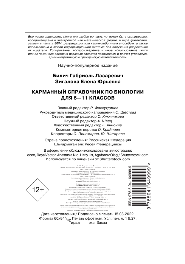 Карманный справочник по биологии для 6-11 классов (Билич Габриэль Лазаревич, Зигалова Елена Юрьевна); ООО "Издательство "Эксмо", 2022