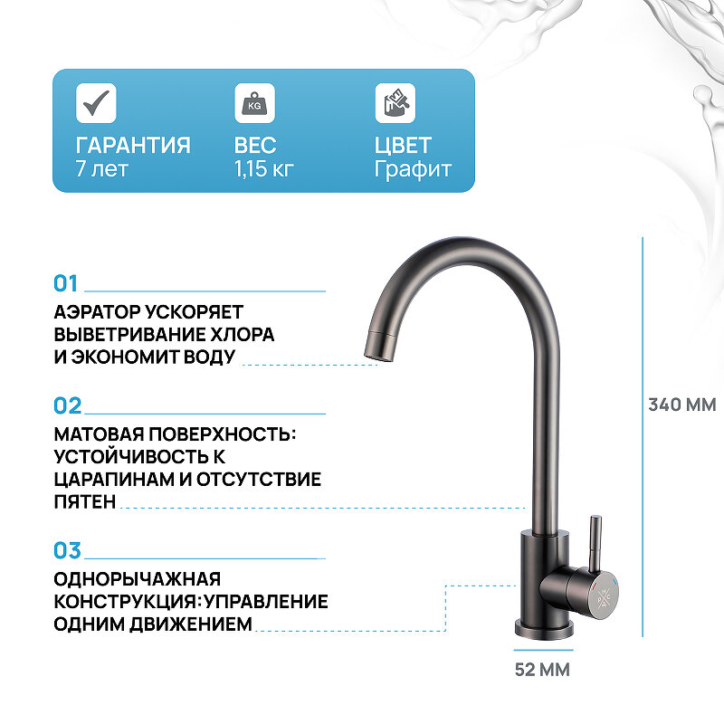 | Цвет производителя | Смеситель для кухни Ростовская Мануфактура Сантехники SUS124PVD-017F Графит |