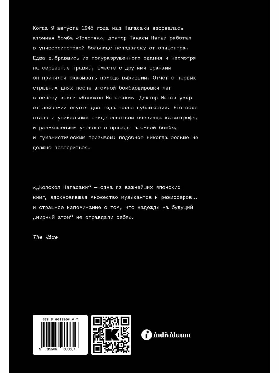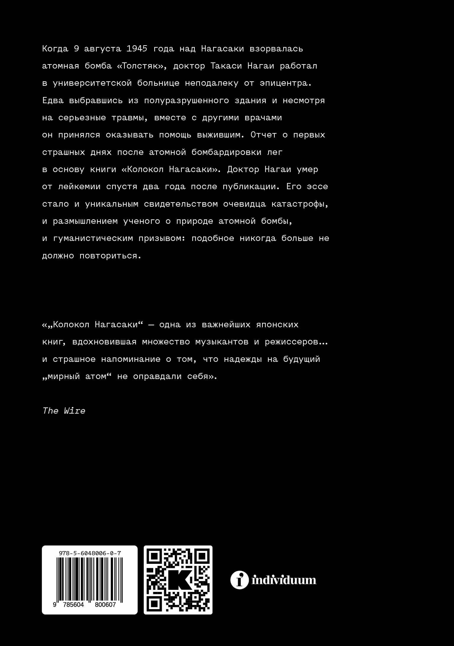 Когда 9 августа 1945 года над Нагасаки взорвалась атомная бомба "Толстяк", доктор Такаси Нагаи работал в университетской больнице неподалеку от эпицентра. Едва выбравшись из полуразрушенного здания и несмотря на серьезные травмы, вместе с другими врачами он принялся оказывать помощь выжившим. Отчет о первых страшных днях после атомной бомбардировки лег в основу книги "Колокол Нагасаки".