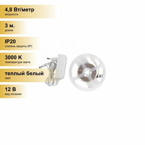 лента светодиодная GENERAL GLS 2835 48Вт 3000К IP20 3м готовый комплект с адаптером (500021)