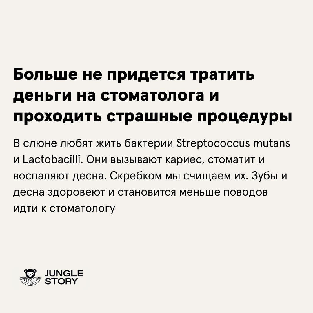 Язык также нуждается в некоторой заботе. Это тоже полезная привычка, чистка языка, благодаря которой снижается количество вредных бактерий в полости рта. Именно от чистоты языка, во многом, зависит свежесть дыхания. Для сравнения: зубы могут быть причиной этой проблемы только в каждом четвертом случае. Почему так? Все просто. На неровной поверхности языка скапливаются остатки еды. В процессе разложения она становится благотворной средой для размножения бактерий. Сам язык в силу физиологического строения не может самостоятельно избавиться от них. Но ему можно и нужно помочь. Кстати, при регулярном использовании скребка обостряются вкусовые ощущения, а это сами понимаете. Происходит обострение вкусовых ощущений, и мы лучше различаем вкус еды. Вы очищаете вкусовые рецепторы. Стоматологи рекомендуют чистить язык 2 раза в день Удобно держится в руке, безопасное приспособление, которое помогает следить за чистотой полости рта, а точнее языка. Этот предмет производится из пшеничной соломы и кукурузного крахмала, не содержит BPA, нефти продуктов и других вредных веществ.