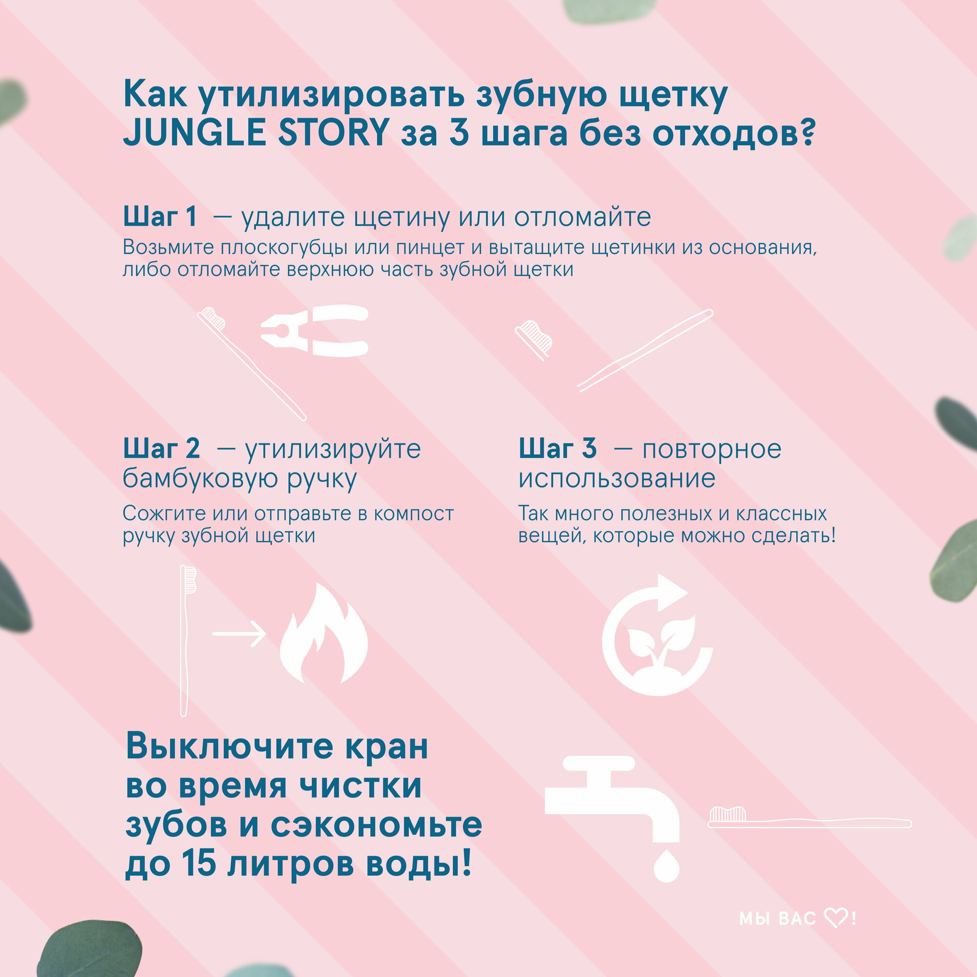 Детский размер & мягкие щетинки. Миниатюрная, дружелюбная зубная щетка и особо мягкая щетина зубной щетки Jungle Story идеально подходит для чувствительных десен, даже когда наши маленькие чистят зубы немного жестче. Конечно же, она обладает отличными очищающими свойствами. Перед использованием следует промыть щетинки. Так как случается иногда, что некоторые щетинки слабее закреплены в натуральной деревянной основе, нежели в пластике и могут частично выпасть. Не волнуйтесь всё в порядке, такое случается, хоть и редко.Щётки Jungle Story мягко чистят зубы, не царапая дёсны и не повреждая эмаль. А окружающая среда будет защищена благодаря использованию возобновляемого сырья. Ручка изготовлена из быстрорастущего бамбука Moso, который биологически разлагается. Щетинки Jungle Story средней мягкости без BPA, эффективно удаляют зубной налет и зубной камень, обеспечивает тщательную чистку зубов, а также защищает десна и они производятся из возобновляемых источников на биологической основе