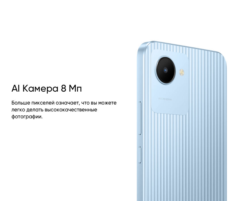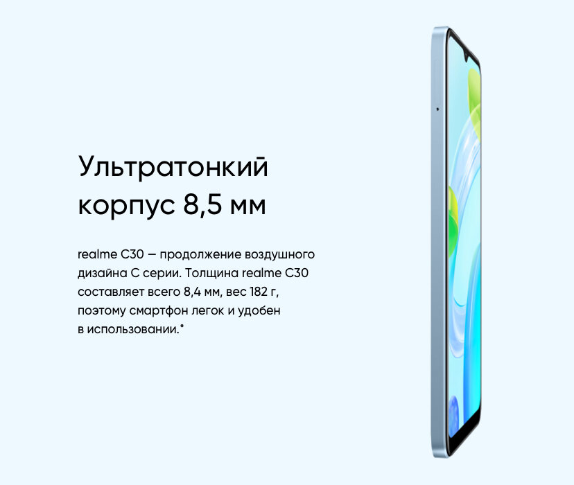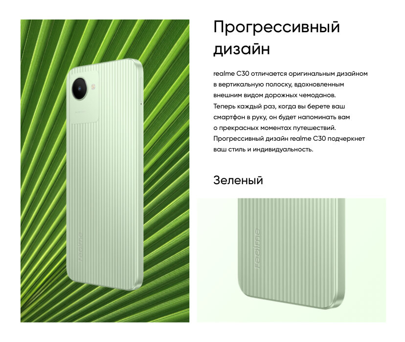 Телефон получил необычный дизайн с рифленой задней крышкой и гладким модулем камеры. Realme C30 получил 6, 5-дюймовый ЖК-экран с разрешением HD+ (1600x720 пикселей) и каплевидным вырезом под 5-мегапиксельную фронтальную камеру. на задней панели располагается один датчик изображения, который снимает с разрешением 8 Мп. Аппаратной основой смартфона стал чип Unisoc T612. Процессор сопровождают 2 Гб оперативной памяти и 32 Гб встроенной флеш-памяти. На смартфон предустановлена ОС Android 11.