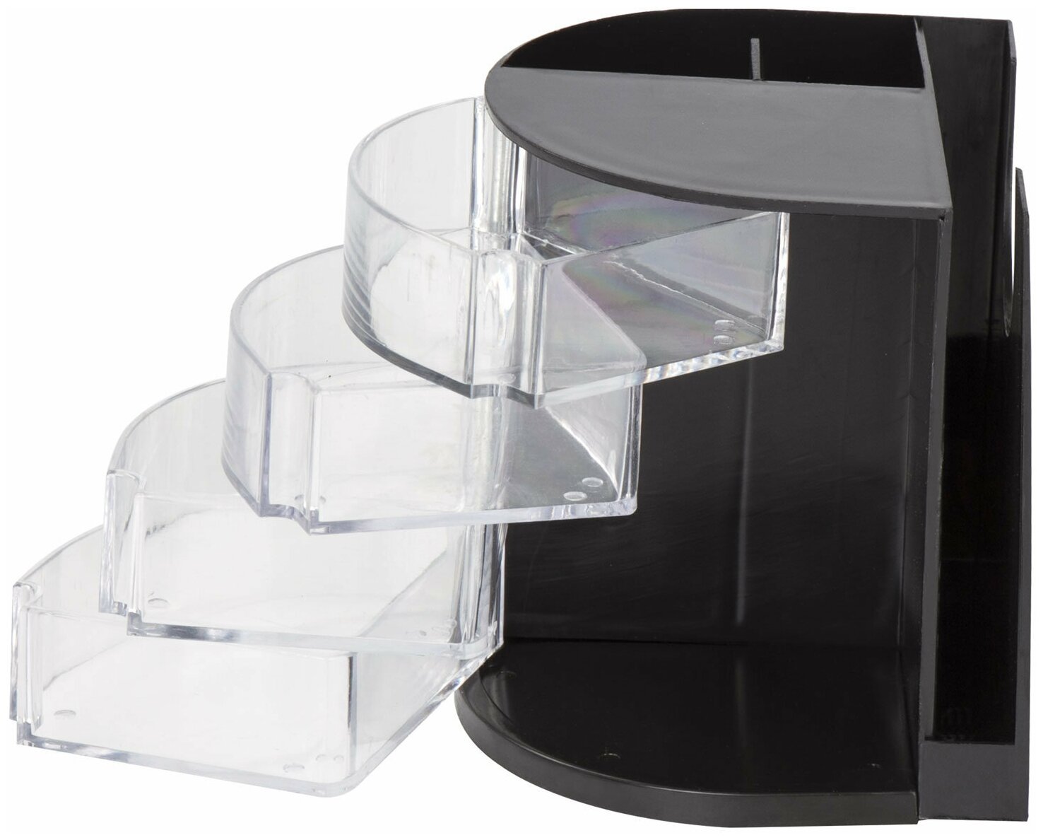 Офисный органайзер Staff Веер с канцелярскими принадлежностями позволяет экономно использовать пространство на рабочем столе. Удобная веерная конструкция обеспечивает свободный доступ к канцелярским мелочам, а его вместимость и комплектация помогут оптимизировать рабочий процесс. Выдвижные лотки выполнены из прозрачного пластика, что позволяет увидеть содержимое, не выдвигая их. Органайзер выполнен из высококачественных материалов и рассчитан на долгий срок службы.