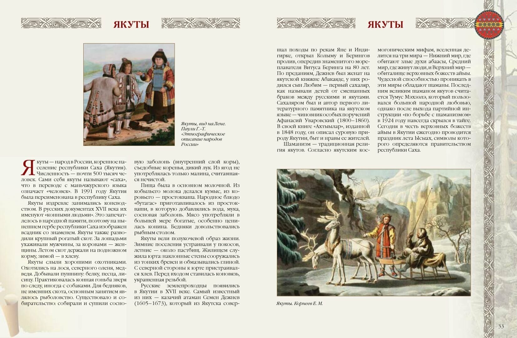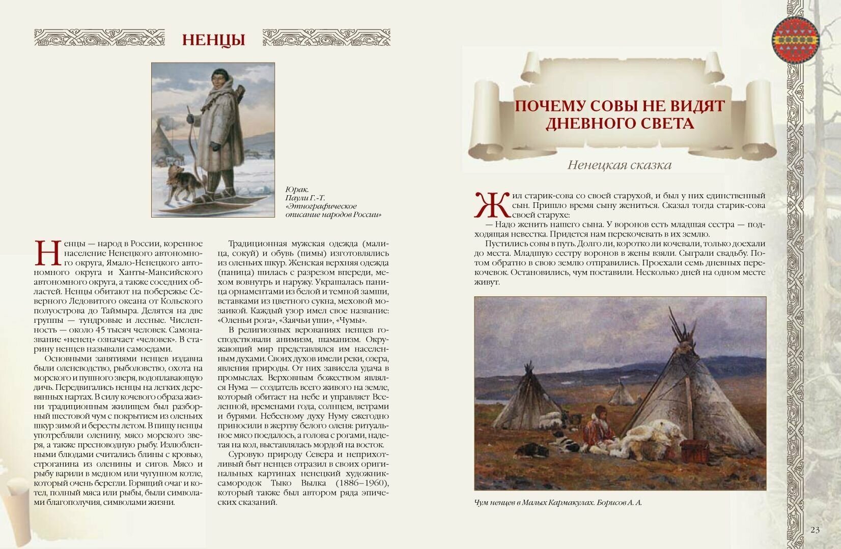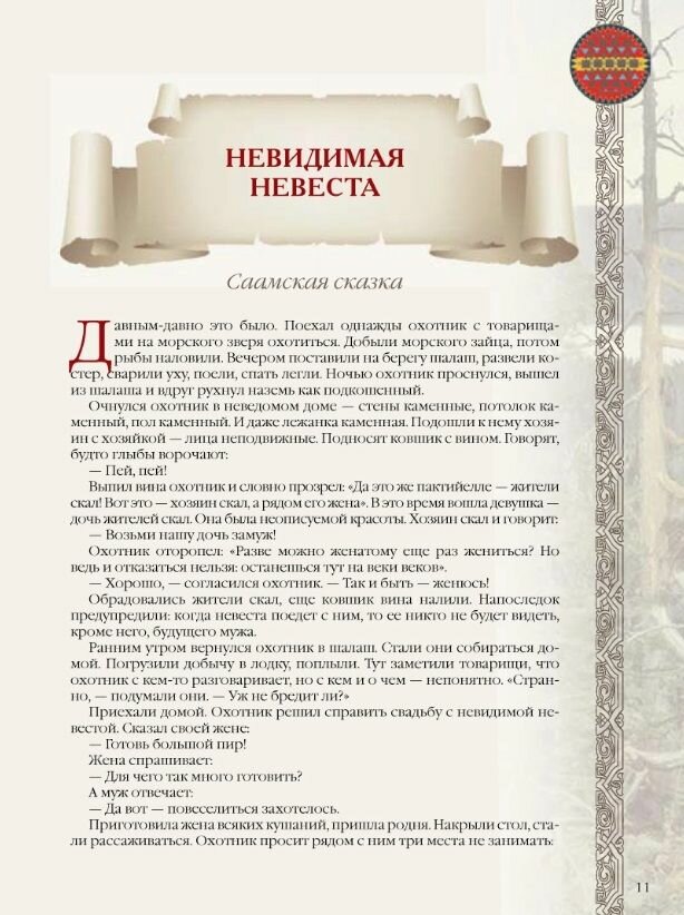 Понравился данный сборник сказок, причём есть и этнографические справки и много изображений(по-моему только один разворот попался без картинок), но это не иллюстации к сказкам, а более-менее тематически подобранные рисунки, фото, картины художников, отпечатано оч хорошо, и замечательно оформлено, как обложка так и страницы, ничего не раздражает, не пестрит, всё чётко и приятно глазу, шрифт средний, бумага норм и по толщине и по качеству, цвета и краски вполне прилично выглядят, без нареканий. Думаю не для малых детей, как само издание в целом так и содержащиеся в нём сказки, есть безобидные и смешные, но многие довольно жёсткие и брутальные, иногда с некоторыми особенностями в отношениях между мужскими и женскими персонажами)), обработка больше суховато-информативно-смысловая, чем певуче-игриво-красноречивая, и это в данном случае подходящий вариант, мне зашло как надо).