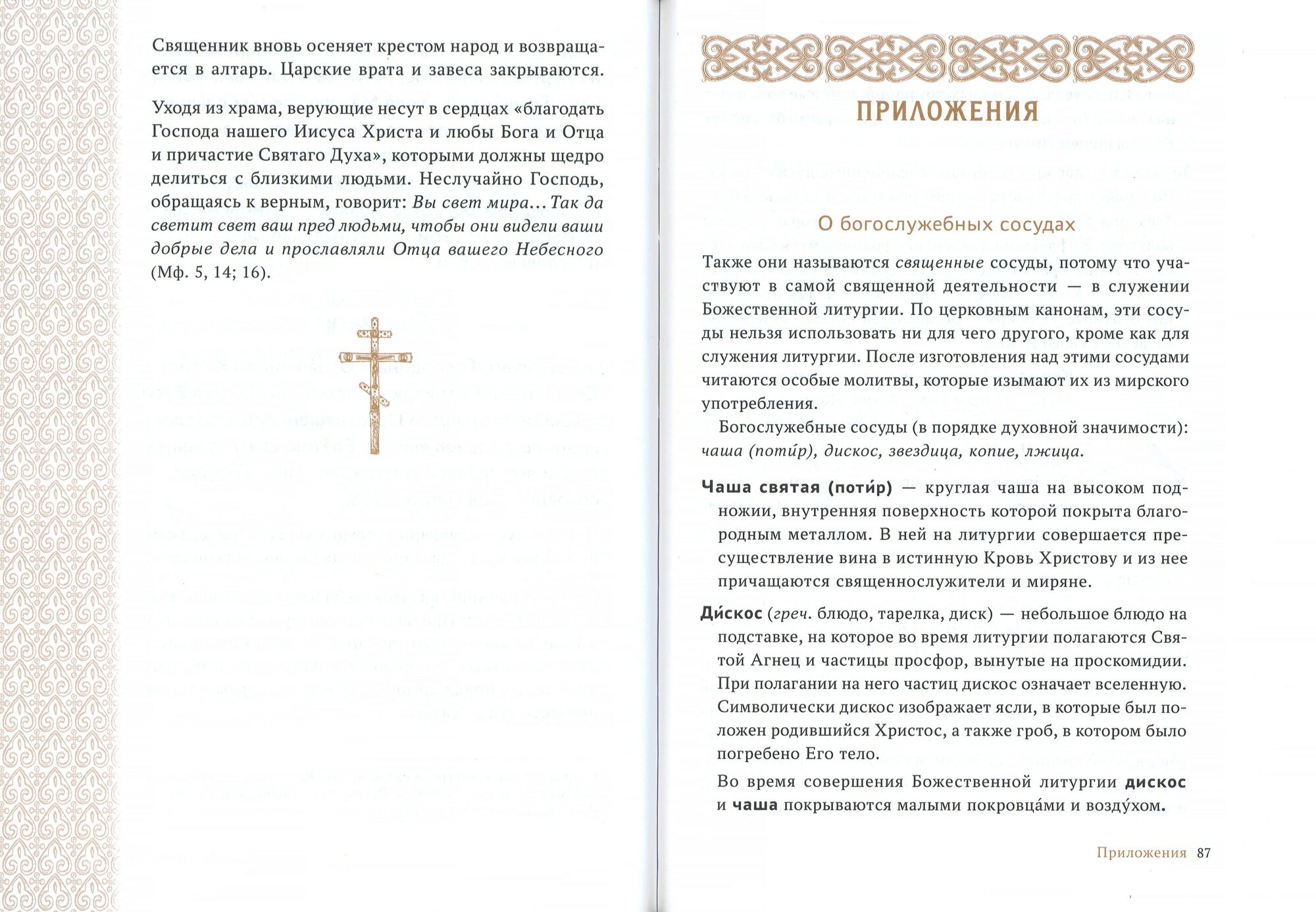 Книга включает в себя последование часов и Божественной Литургии. Она поможет православным христианам глубже понять богослужение и полнее соучаствовать в нем молитвой. Текст Литургии сопровождается краткими пояснениями и переводом сложных для понимания слов и выражений. Наиболее значимые моменты богослужения дополнительно разъясняются в разделе «Приложения». Книга будет полезна всем верующим, особенно тем, кто только начинает свой путь в Церкви.