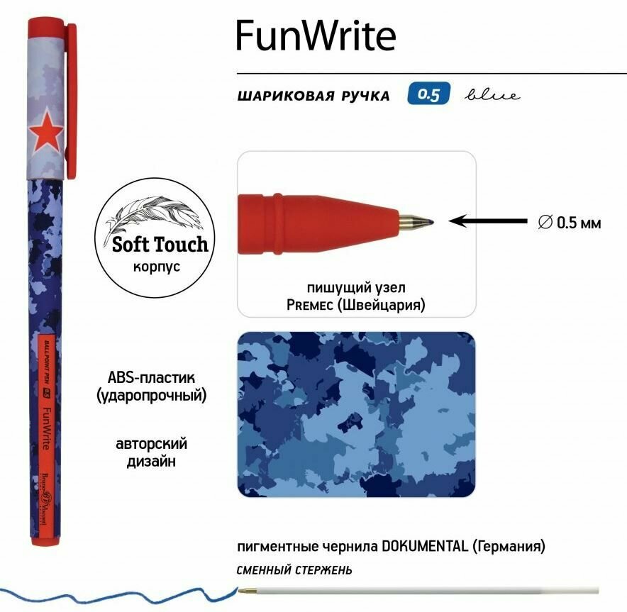 Ручки «FunWrite» от Bruno Visconti обладатели таких характеристик: бархатистое покрытие Soft Touch, немецкое качество чернил DOKUMENTAL и пишущий узел Premec (Швейцария). Корпус изготовлен из ABS-пластика, который гнется при ударе или сильном нажиме, но не ломается. Оригинальный дизайн ручки как «вишенка на торте» - дополнительная характеристика, не позволяющая отказаться от ее обладания.