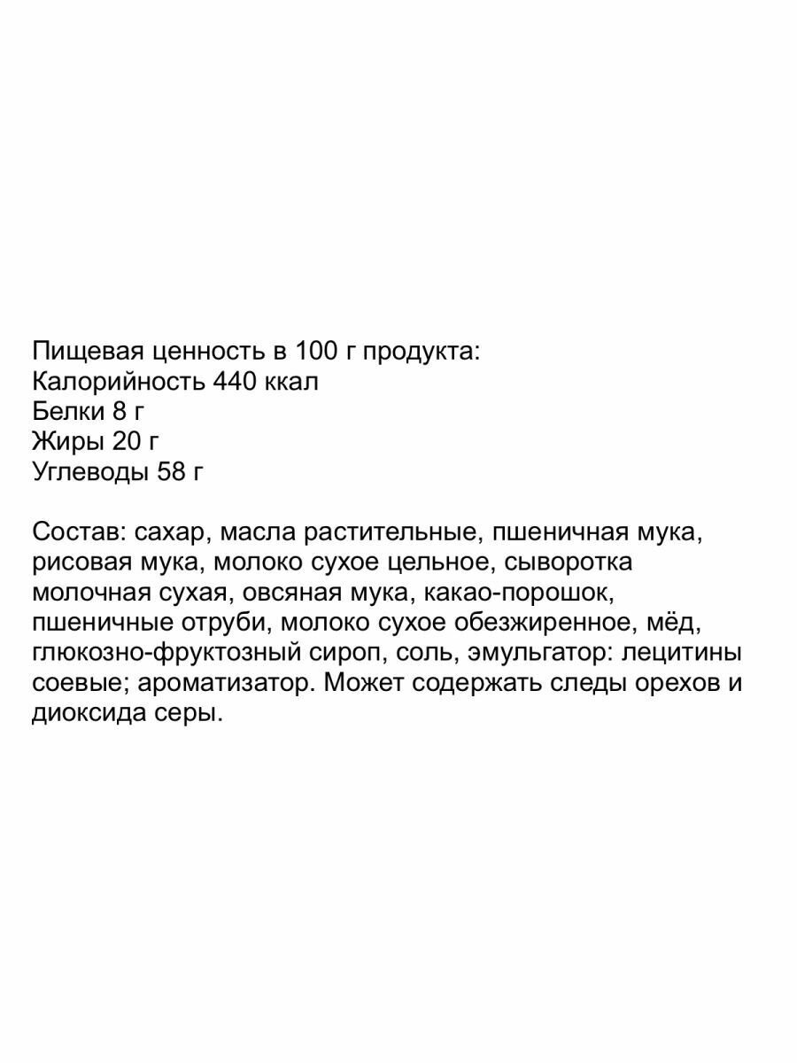 | Состав | Зерновые продукты (крупа кукурузная, пшеница, крупа рисовая, овес), сахар, патока, какао-порошок, экстракт ячменно-солодовый (солод ячменный пивоваренный, ячмень, вода), масло подсолнечное рафинированное дезодорированное, эмульгатор соевый лецитин, соль (содержит агент антислеживающий Е536), ароматизаторы (шоколад, ваниль). |