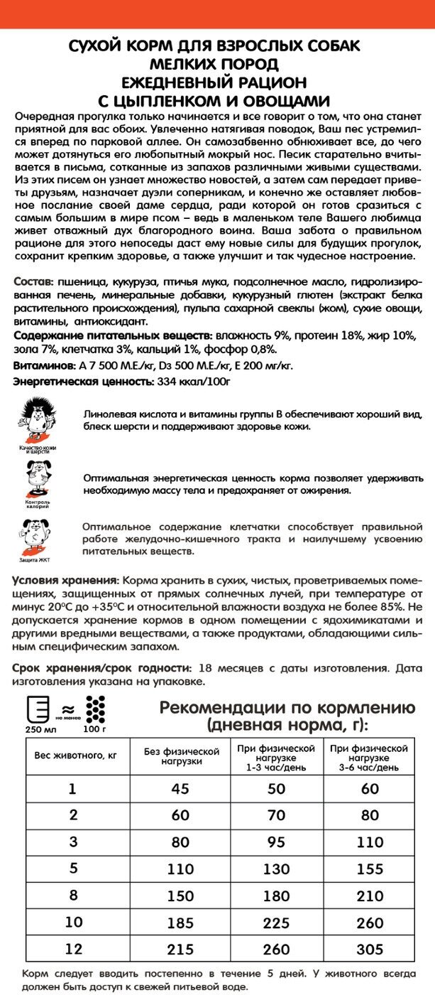 Для взрослых собак мелких пород с цыплёнком и овощами Линолевая кислота и витамины группы В обеспечивают хороший вид, блеск шерсти и поддерживают здоровье кожи. Оптимальная энергетическая ценность корма позволяет удерживать необходимую массу тела и предохраняет от ожирения. Оптимальное содержание клетчатки способствует правильной работе желудочно-кишечного тракта и наилучшему усвоению питательных веществ. Состав: пшеница, кукуруза, птичья мука, подсолнечное масло, гидролизированная печень, минеральные добавки, кукурузный глютен (экстракт белка растительного происхождения), пульпа сахарной свеклы (жом), сухие овощи, витамины, антиоксидант. Содержание питательных веществ: влажность 9%, протеин 18%, жир 10%, зола 7%, клетчатка 3%, кальций 1%, фосфор 0,8% Витаминов: A 7500 М. Е./кг, D3 500 М. Е./кг, Е 200 мг/кг Энергетическая ценность: 334 ккал/100г Условия и срок хранения: Корма хранить в сухих, чистых, проветриваемых помещениях, защищенных от прямых солнечных лучей, при температуре от минус 20 С до +35 С и относительной влажности воздуха не более 85%. Не допускается хранение кормов в одном помещении с ядохимикатами и другими вредными веществами, а также продуктами, обладающими сильным специфическим запахом. Срок хранения/срок годности: 18 месяцев с даты изготовления. Дата изготовления указана на упаковке. Рекомендации по кормлению: Вес животного, кг Без физической нагрузки Физическая нагрузка 1-3 часа в день Физическая нагрузка 3-6 часов в день 1 45 50 60 2 60 70 80 3 80 95 110 5 110 130 155 8 150 180 210 10 185 225 260 12 215 260 305 Корм следует вводить постепенно в течение 5 дней. У животного всегда должен быть доступ к свежей питьевой воде.