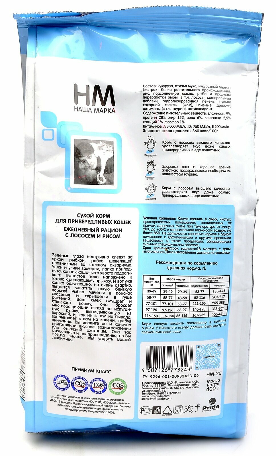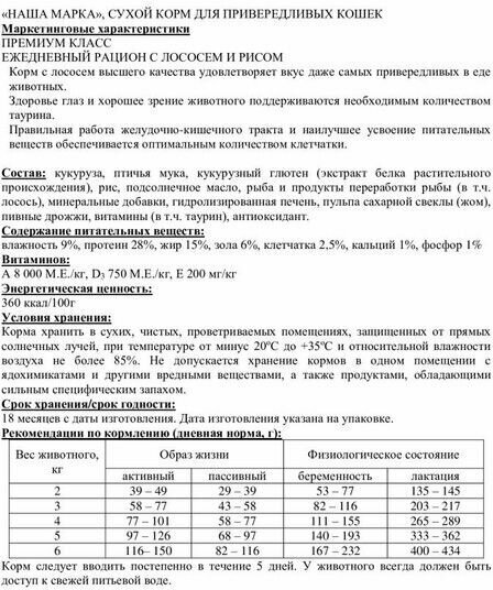 | Состав | Состав: кукуруза, птичья мука, кукурузный глютен (экстракт белка растительного происхождения), рис, подсолнечное масло, рыба и продукты переработки рыбы (в т.ч. лосось), минеральные добавки, гидролизированная печень, пульпа сахарной свеклы (жом), пивные дрожжи, витамины, антиоксидант, таурин. Содержание питательных веществ: влажность 9%, протеин 28%, жир 15%, зола 6%, клетчатка 2,5%, кальций 1%, фосфор 1% Витаминов |