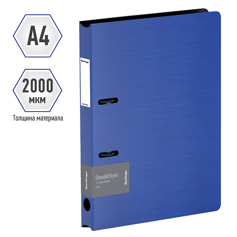 Папка на 2-х кольцах Berlingo серии Steel&Style формата А4 - замечательный аксессуар для офиса и учёбы, выполненный в классическом офисном стиле. Увеличенная толщина обложки из полифома - 2000 мкм. Насыщенный синий цвет внешней стороны в сочетании с фактурой "сталь", а также чёрный цвет внутренней поверхности. Ширина корешка составляет 35 мм. Специальная D-форма колец помогает удобно и ровно хранить документы, которые могут быть выровнены по левому краю, благодаря боковой вертикальной стенке кольца. Кольца диаметром 25 мм и фурнитура тоже выполнены в чёрном цвете. Вместимость папки – 200 листов. Специальные формовые отверстия в обложке служат для надежного защелкивания папки в сложенном виде, предотвращают случайное открытие обложки и замятие документов внутри при хранении и транспортировке. Специальная наклейка на корешке, позволяющая делать пометки о содержимом, в комплекте есть дополнительная наклейка. Папка может использоваться как регистратор и устойчиво храниться в вертикальном положении. Эргономичная круглая вырубка в корешке для быстрого извлечения папки из хранилища. Размер папки составляет 310*260*35 мм. Упакована в индивидуальный пакет с липким краем.