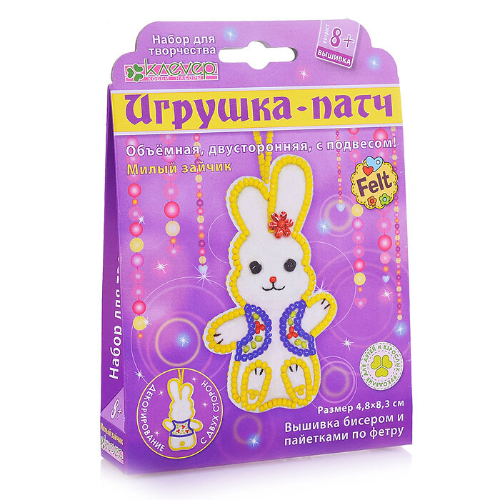 Милый зайчик - стилизованная двусторонняя набивная игрушка из белого фетра, декорированная цветным контрастным бисером и блестящей яркой пайеткой. С помощью набора "Милый зайчик" ребёнок старше 8 лет научится шить простые игрушки и вышивать несложные декоративные узоры: нашьёт на фетр нити с бисером и украсит их пайеткой для акцента, вырежет из фетра стилизованные силуэты, сошьёт их вместе и наполнит синтепухом — получится игрушка-подвес — «солнечный» милый зайчик — брелок для сумочки или брошь.