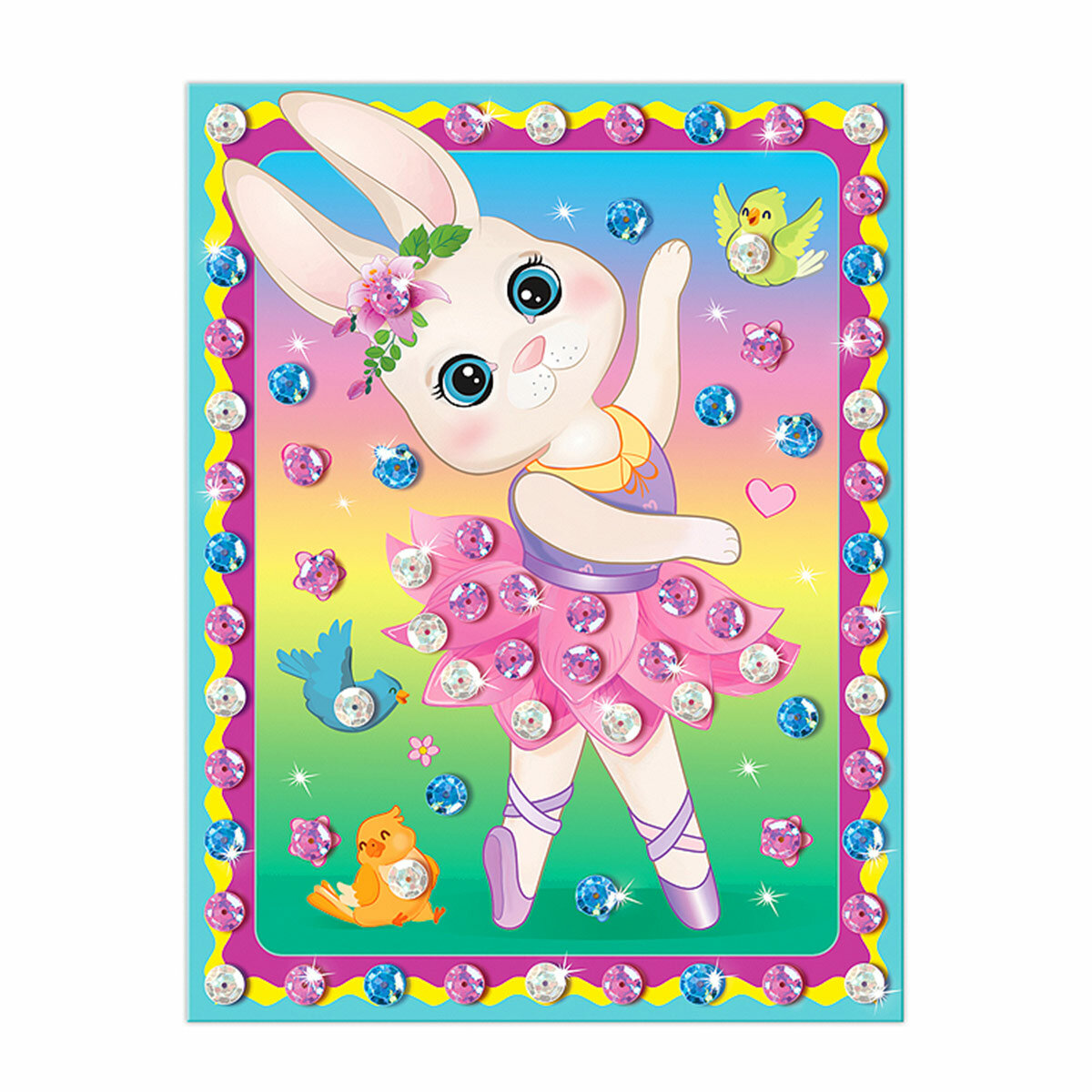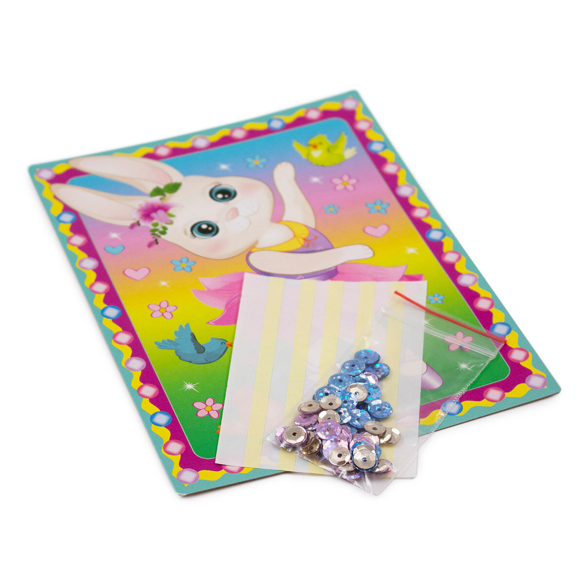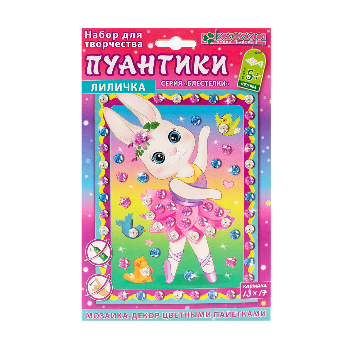 Комплектация: картонная основа (фон), разноцветные пайетки, двусторонняя клейкая лента (скотч), инструкция на обороте упаковки.