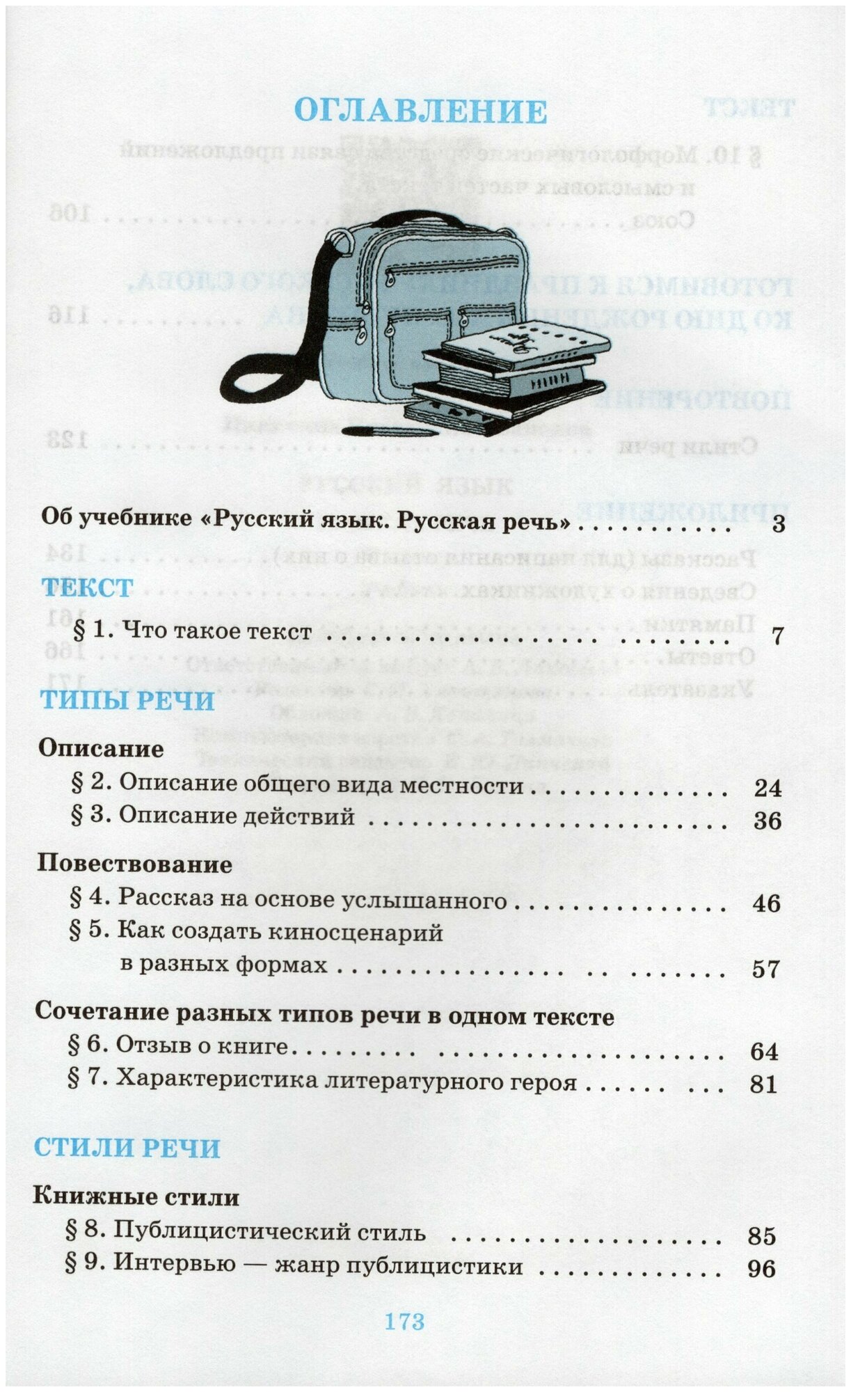 Учебник «Русский язык. Русская речь» является неотъемлемой частью УМК по русскому языку для 5-9 классов, хорошо зарекомендовавшего себя в школе и известного учителям и учащимся. Учебник помогает ученику в овладении устной и письменной речью. Он учит вести беседу; составлять планы к творческим работам; писать изложения и сочинения на свободную тему, по картине, а также писать отзывы и рецензии; видеть образные средства языка и использовать их в своей речи. Книга содержит разнообразный и интересный дидактический материал. Учебник соответствует ФГОС и включён в Федеральный перечень учебников.